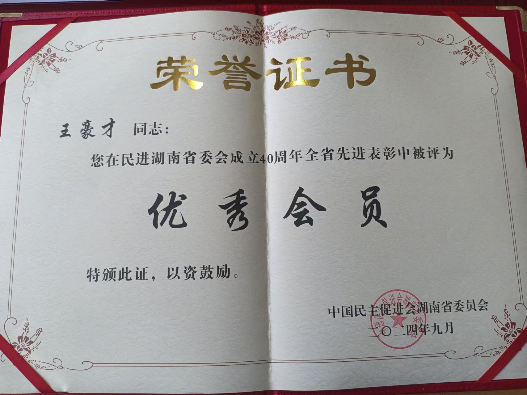 本网讯(通讯员 李焕品)9月4日,在长沙召开的民进湖南省委会成立40周年庆祝大会上,我校教师、民进会员王豪才荣获表彰,被评为“优秀会员”。全国人大常委会副委员长、民进中央主席蔡达峰出席庆祝大会,并向获奖者代表颁奖。