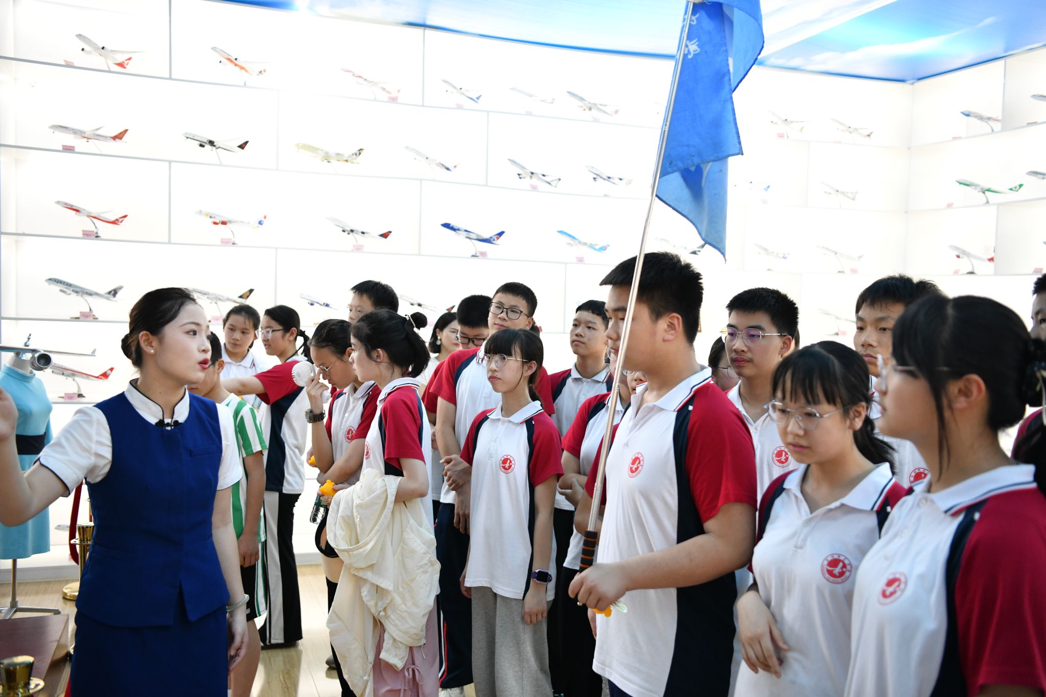 在航空客舱与飞机模型综合模拟实训中心,同学们有序走进模拟客舱,体验了一回“小小飞行员”和“小乘务员”,感受着航空飞行的独特魅力,触摸蓝天梦想。