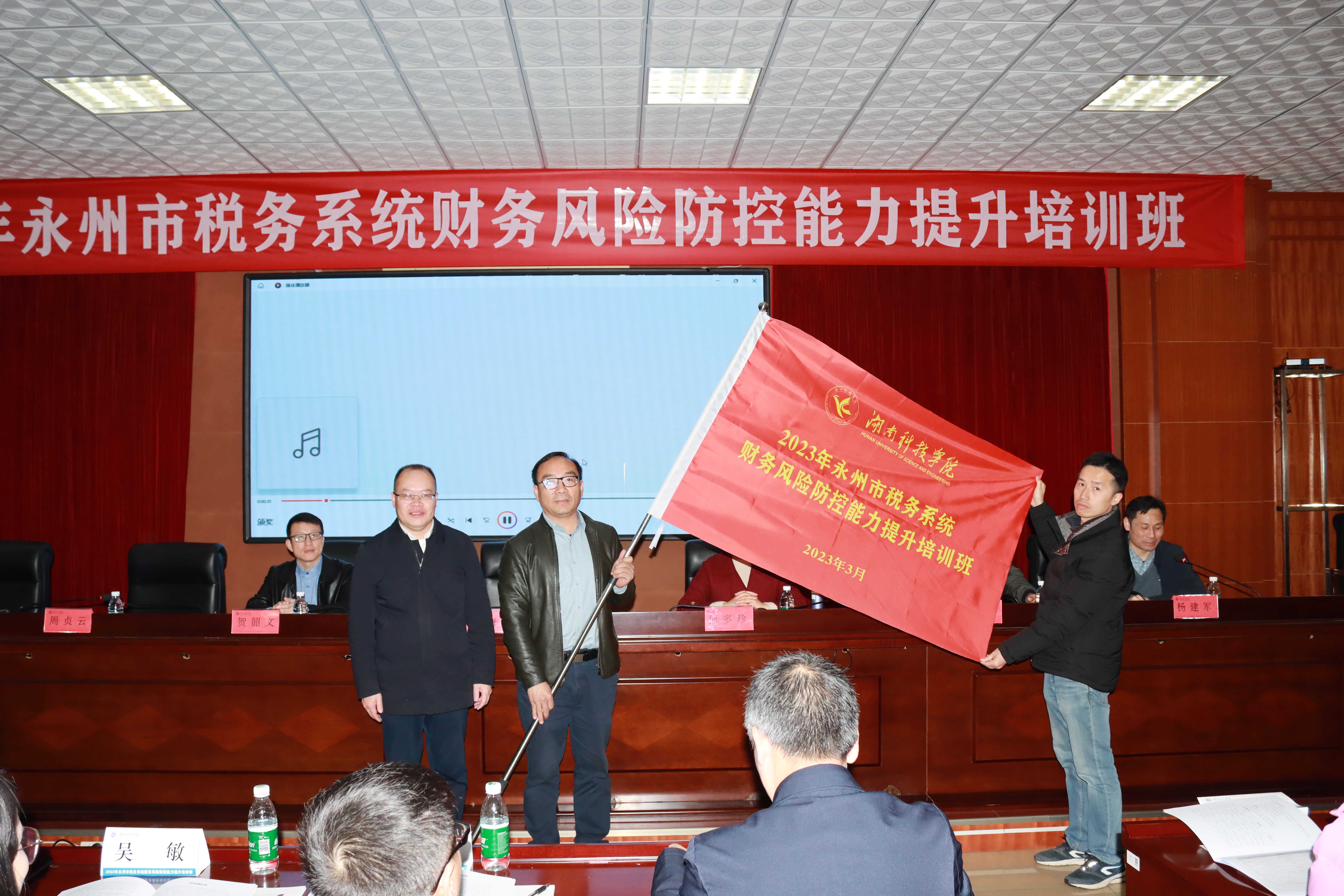 本网讯(通讯员 邹小阳)3月29日上午,国家税务总局永州市税务局和继续教育学院联合举办的2023年全市系统财务风险防控能力提升培训班在我校开班。国家税务总局永州市税务局党委委员、副局长何多珍作开班动员,党委委员、副校长何海为培训班授旗,继续教育学院副院长杨建军主持开班仪式。