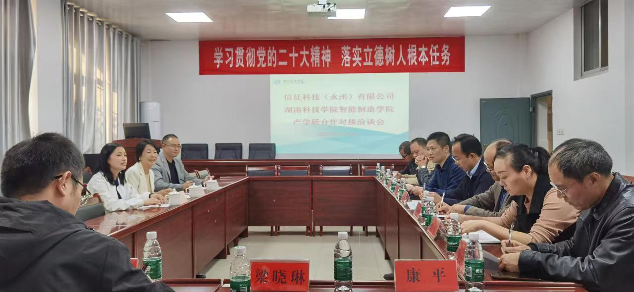 本网讯(通讯员 康平)为持续深入推进校企产学研合作,开拓毕业生实习就业岗位。近日,信征科技(永州)有限公司总经理曾棱一行专程到智能制造学院开展产学研合作洽谈。该院班子成员、教授、博士代表、系主任、辅导员参加洽谈会。这是10月26日学院赴永州市经开区开展“学习贯彻党的二十大精神·博士教授入企专项调研”的有效对接和延伸。