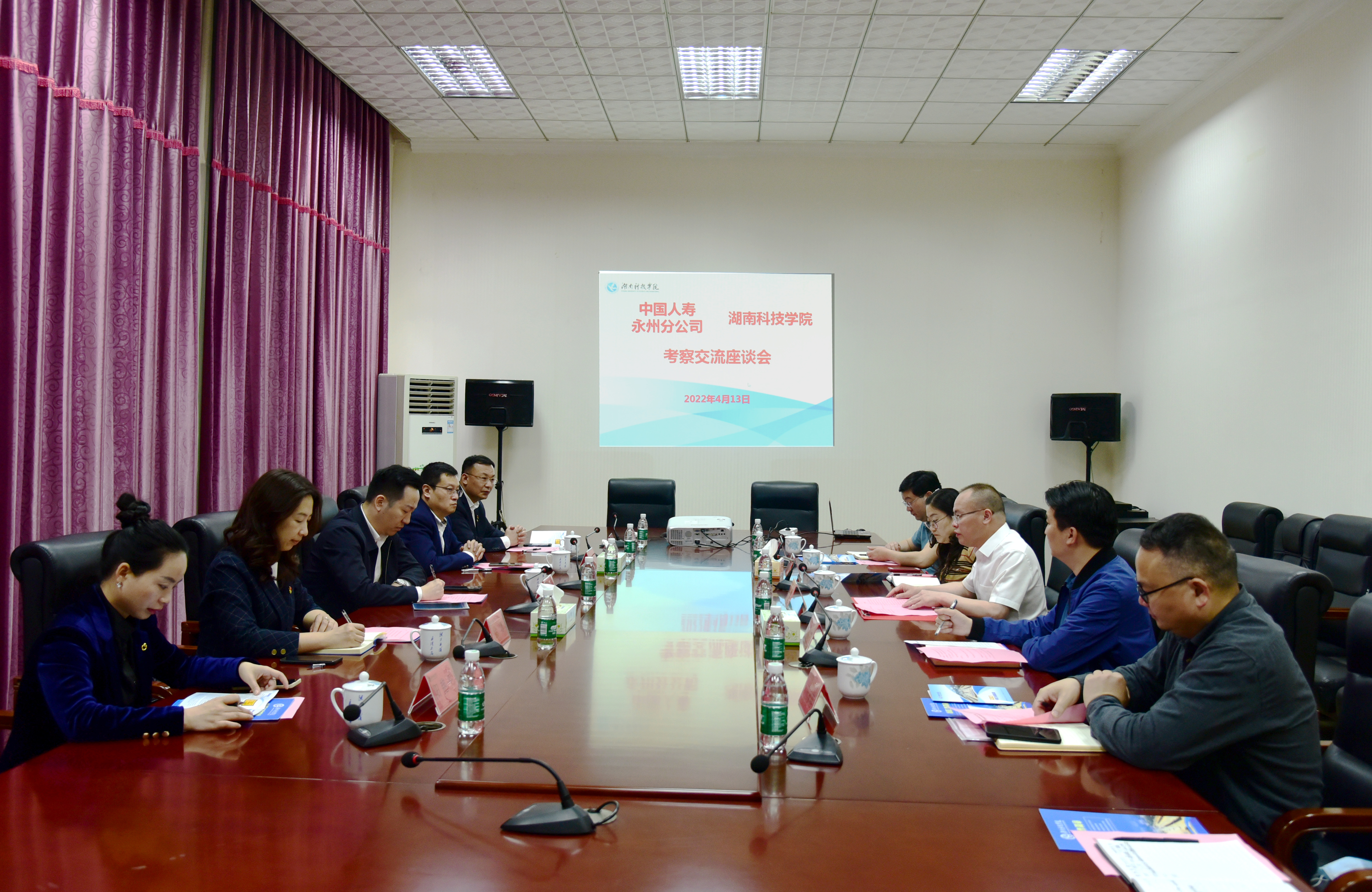 本网讯 4月13日,中国人寿永州分公司党委书记、总经理刘翀一行来校考察交流。学校党委委员、副校长何海,继续教育学院院长唐君和招生就业处相关负责人参加座谈会。