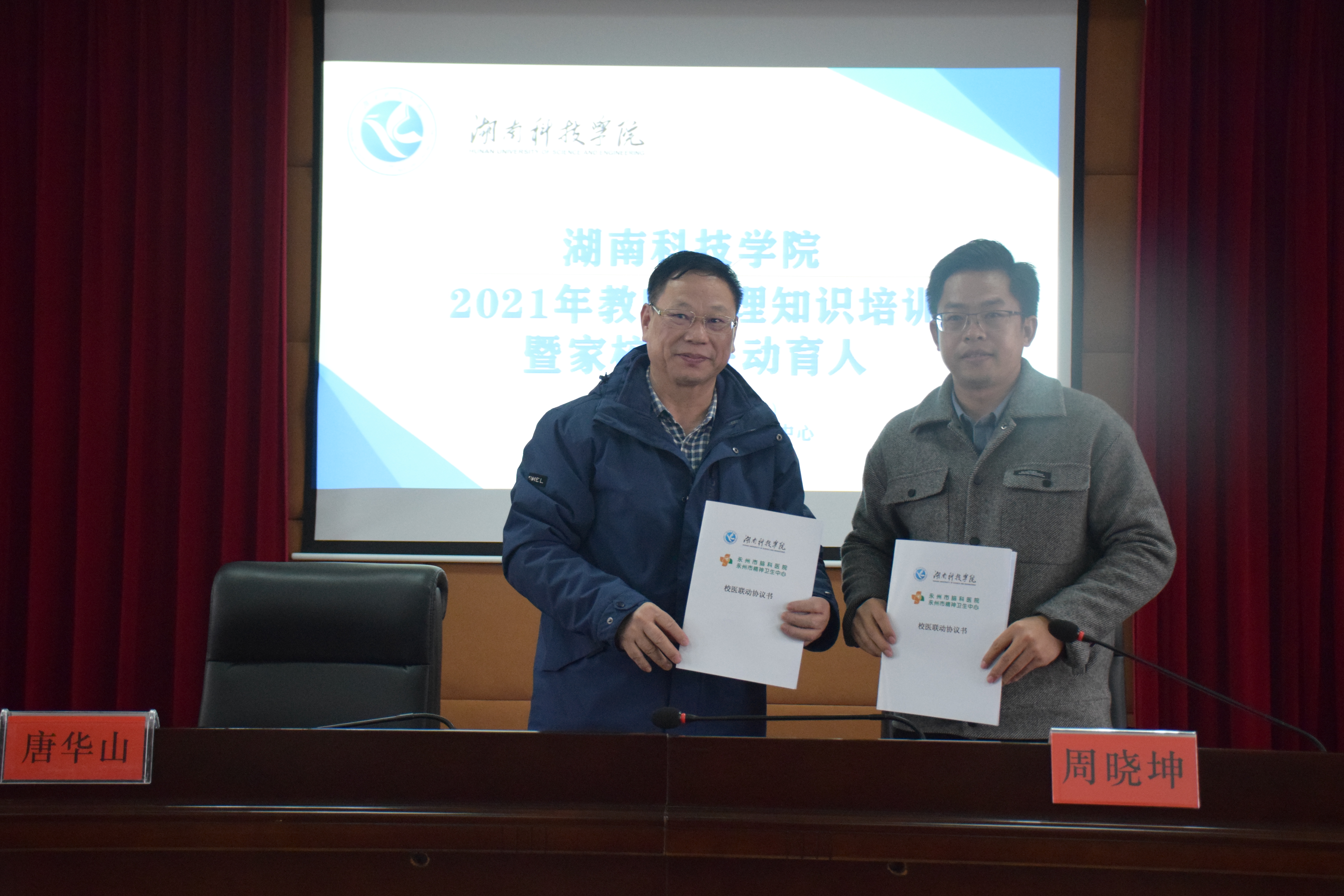 唐华山与周晓坤代表双方单位签订“校医联动”合作协议。唐华山部长对协表示协议的签订标志着学校在家校医联动育人工作体系上又迈出了坚实的一步,在医院的专业指导下,学校心理健康教育工作的针对性和实效性必定会再上新台阶。下一步,学校将通过沙龙、讲座、督导、见习等方式深化校医合作,不断提升学生工作队伍专业素养,强化人才培养质量。