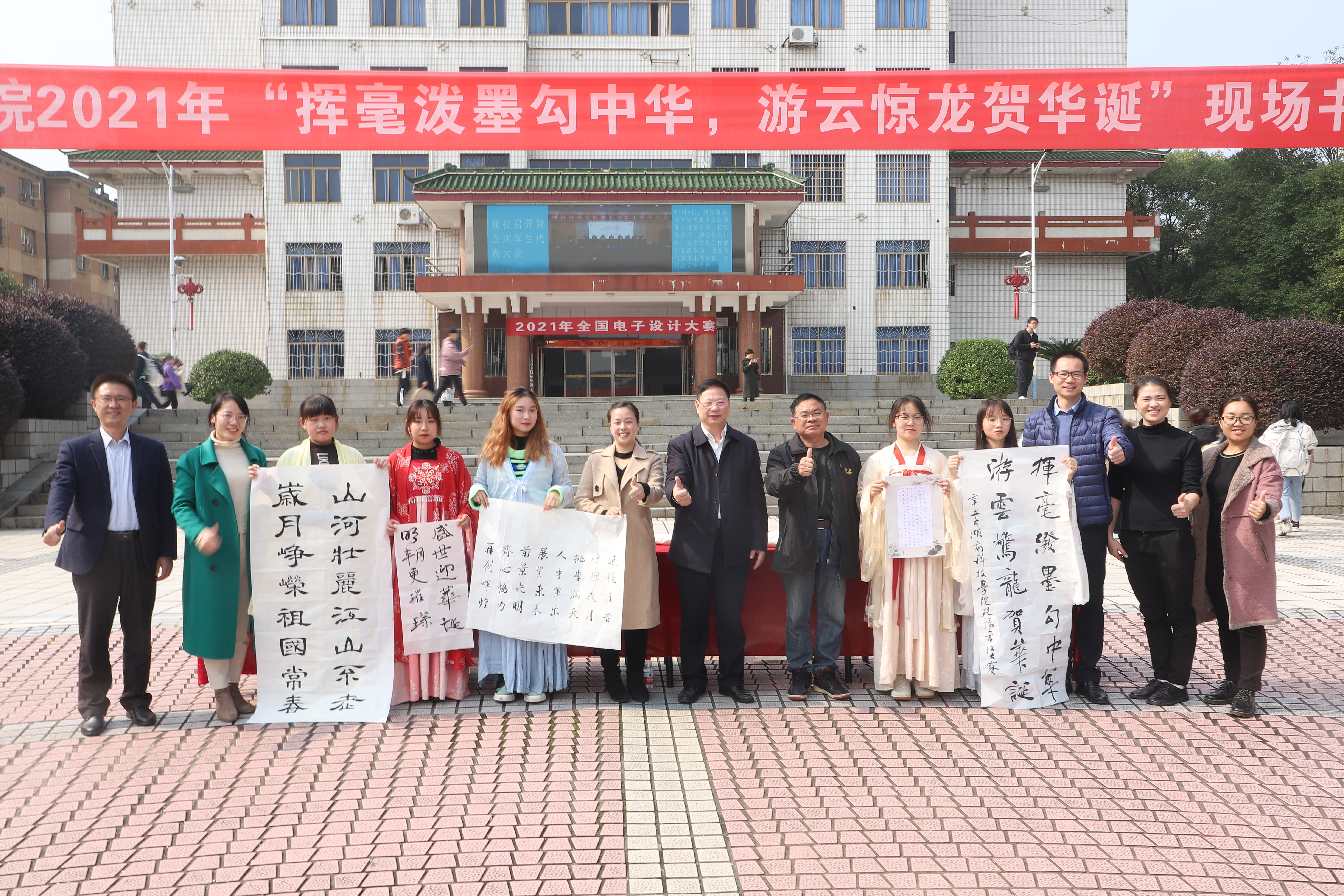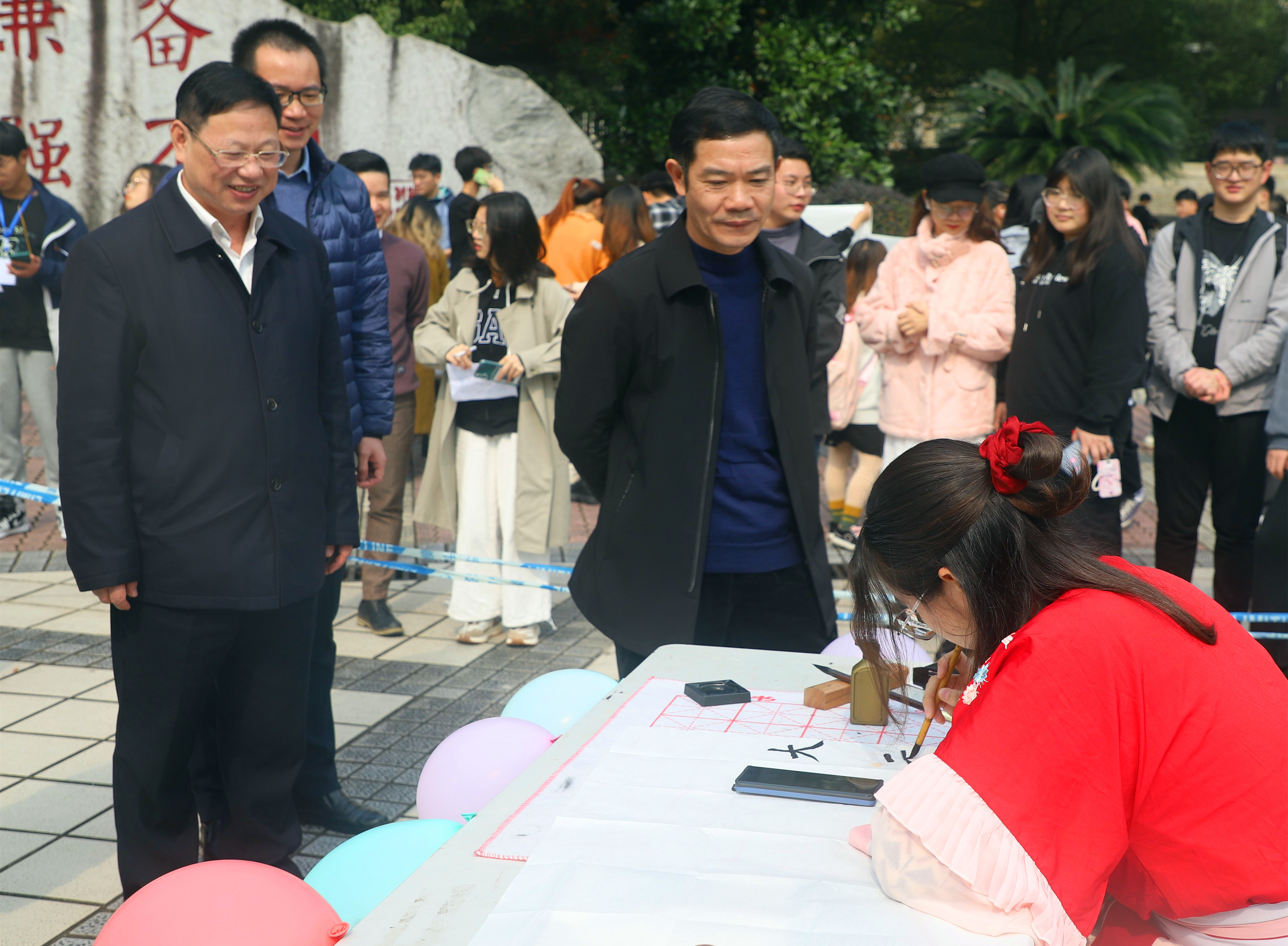 本网讯 11月18日上午,“挥毫泼墨勾中华,游云惊龙贺华诞”现场书法大赛在文化广场举行,党委委员、副校长吴小林,学工部部长唐华山、校书法研究所所长唐幼铎、校团委和美术与艺术设计学院相关负责人参加了活动。