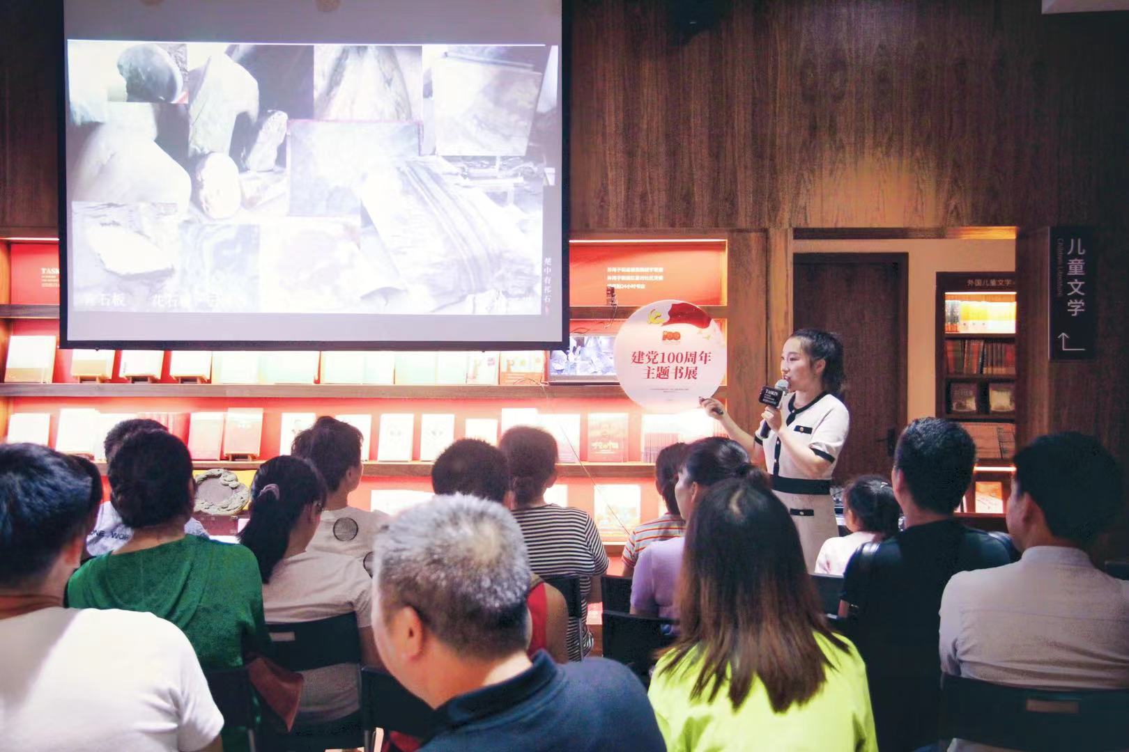 本网讯 近日,星空app官网美术与艺术设计学院视觉传达系邓子戈老师为献礼建党100周年,于长沙德思勤城市广场书店开展社会艺术教育专题讲座,她以《楚中有祁石—湖南永州祁阳石文化赏析》为题,为社会艺术爱好者讲述了国家地理标志祁阳石相关知识,展现了永州的非遗文化无限魅力,大家纷纷表示此次讲座受益匪浅。此次讲座也是该院立足永州、服务地方,推广永州地方文化,响应国家美育“硬指标”,循序渐进做好高校艺术教育普惠大众的第一步。