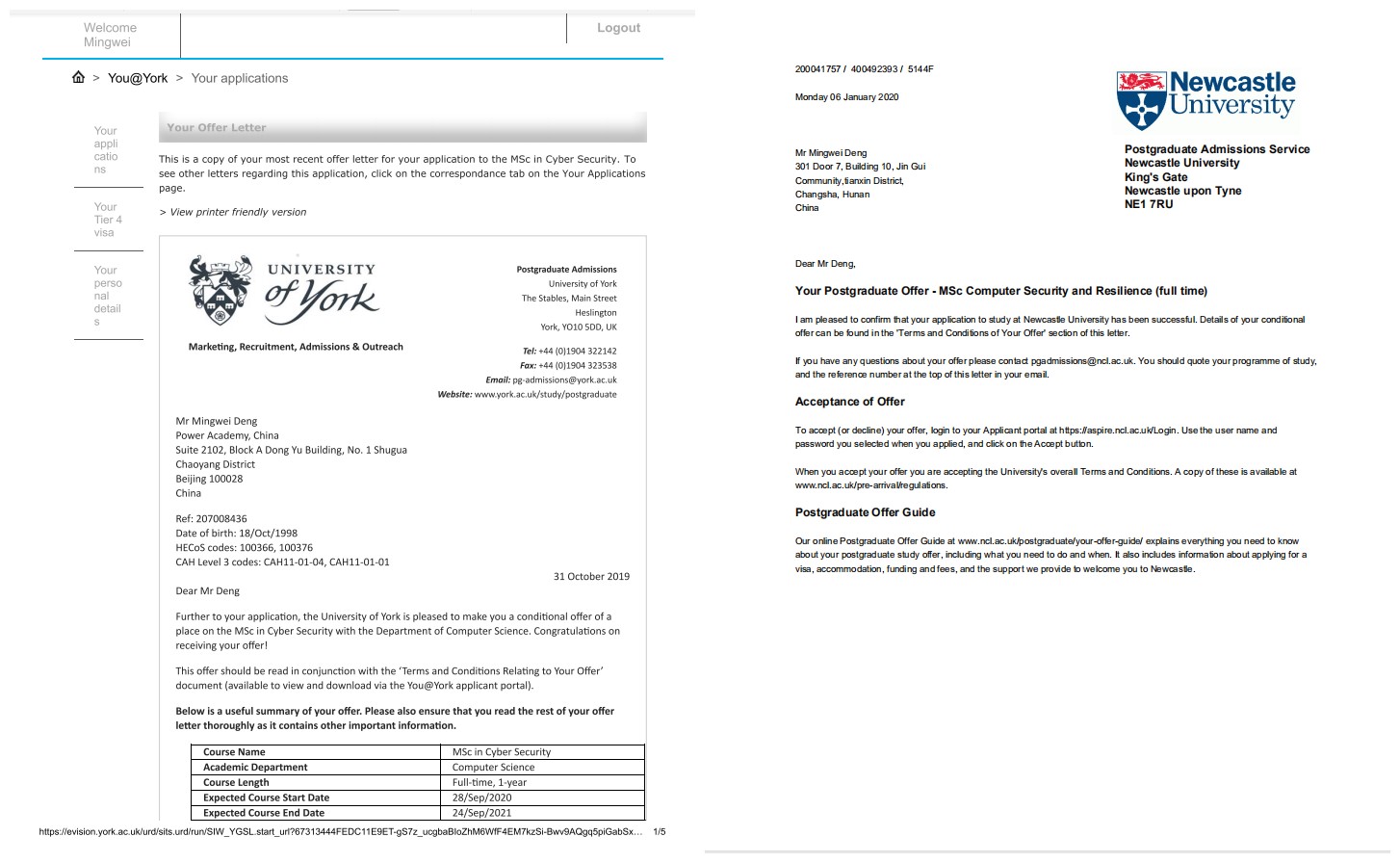 本网讯 近日,我校电子与信息工程学院软件1601班的邓铭巍同学同时收到了来自英国约克大学和纽卡斯尔大学的研究生录取通知书。