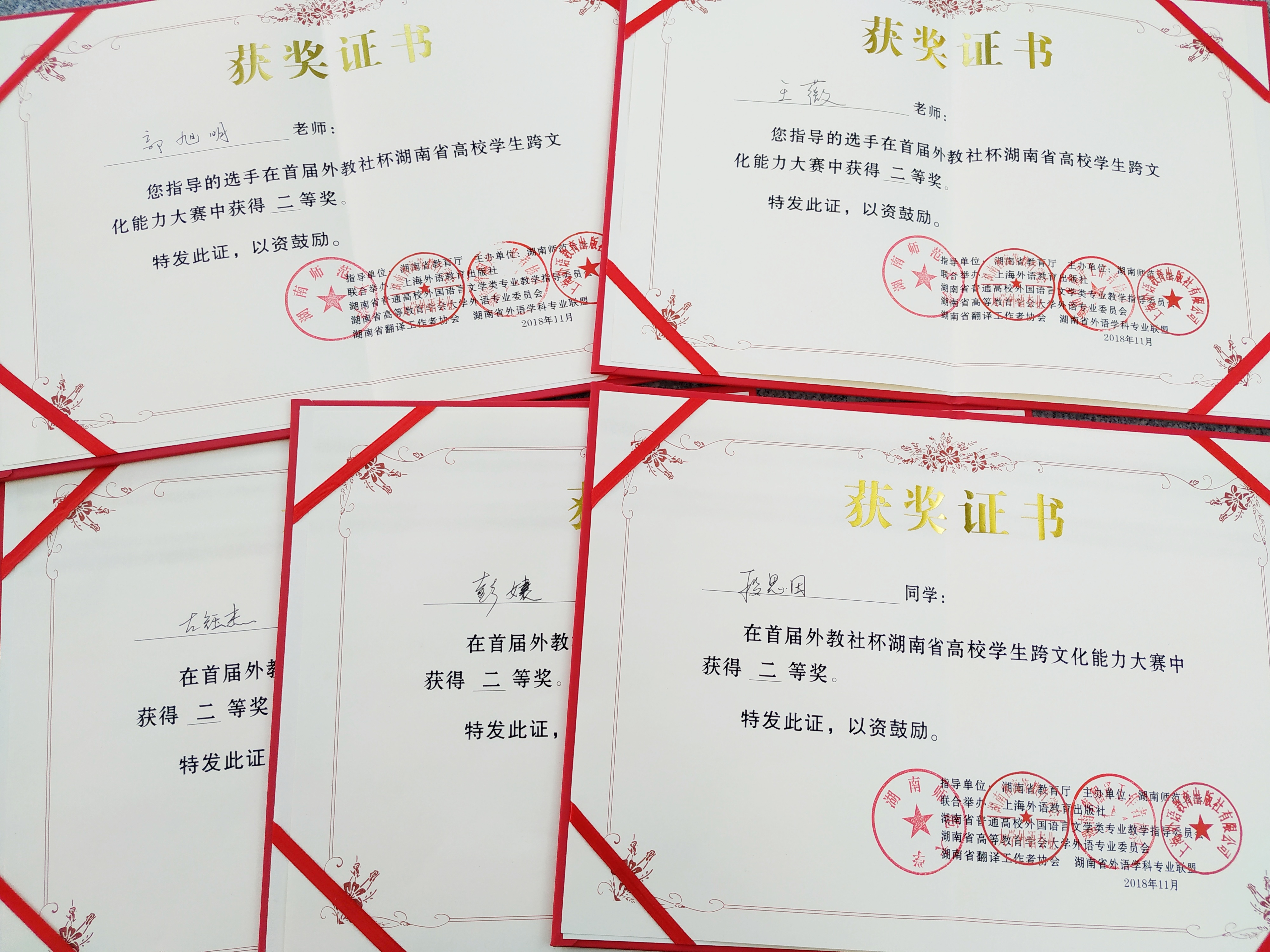 本网讯  11月25日,第一届“外教社杯”湖南省高校学生跨文化能力大赛在湖南师范大学落下帷幕,我校英语1603班彭婕、汉文1603班段思田和国贸1602班左钰杰组成的团队从激烈的竞争中脱颖而出,荣获二等奖。