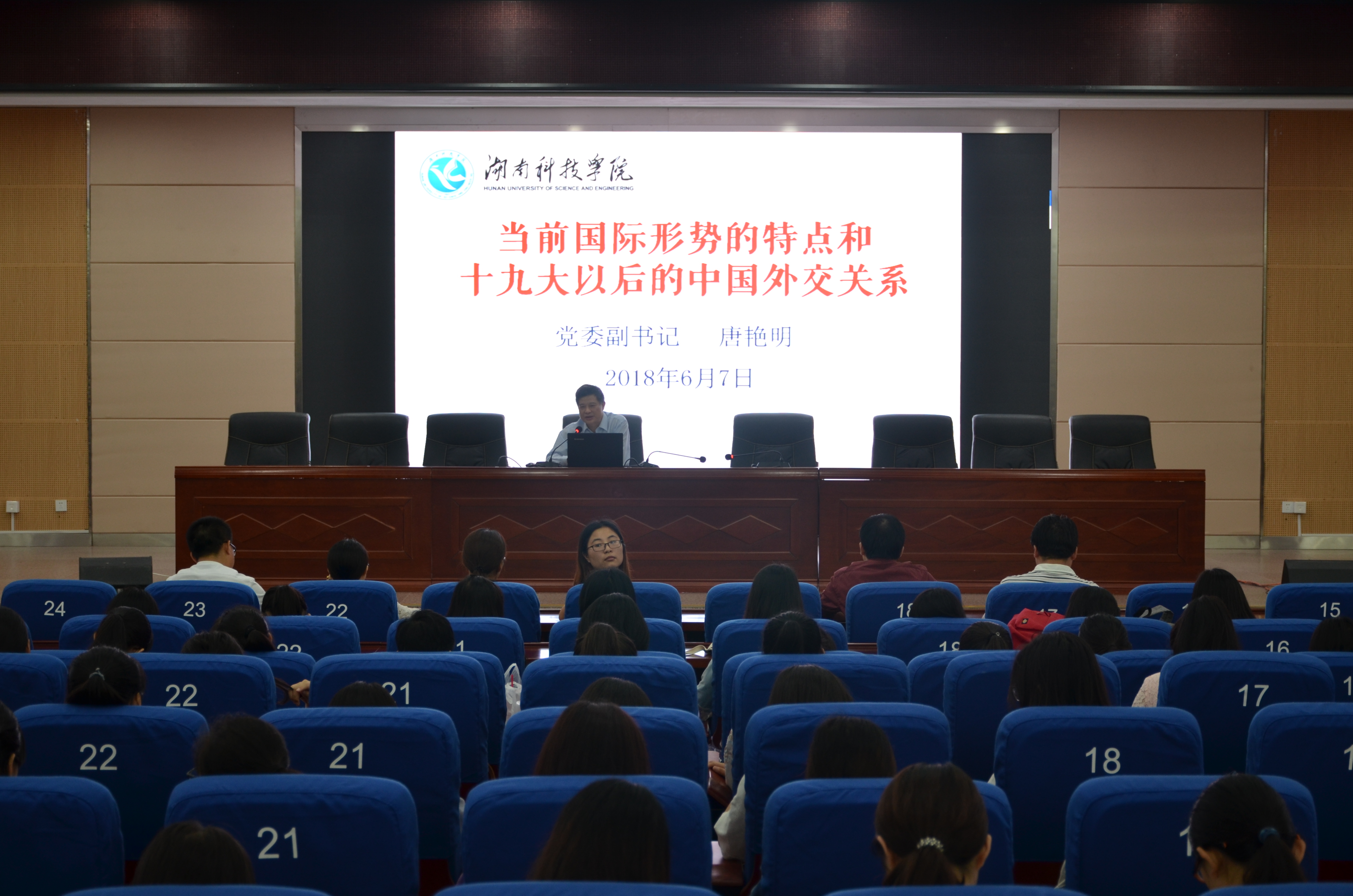 本网讯 为进一步提高青年学子对当前国际形势的认识,深化对党和国家方针政策的理解,增强其责任感和使命感。6月7日晚,人文与社会科学学院邀请党委副书记唐艳明为该院学子作题为《当前国际形势的特点和十九大以后的中国外交关系》的专题讲座。唐艳明分析了当前的国际形势,并从新的指导思想、新定位、新风格、新理念、新战略、新方式、新实践、新的全球治理观等方面,对十八大以来特别是十九大后我国外交的变化进行深度剖析,详细分析了我国外交现在采取的措施和将要应对的挑战。