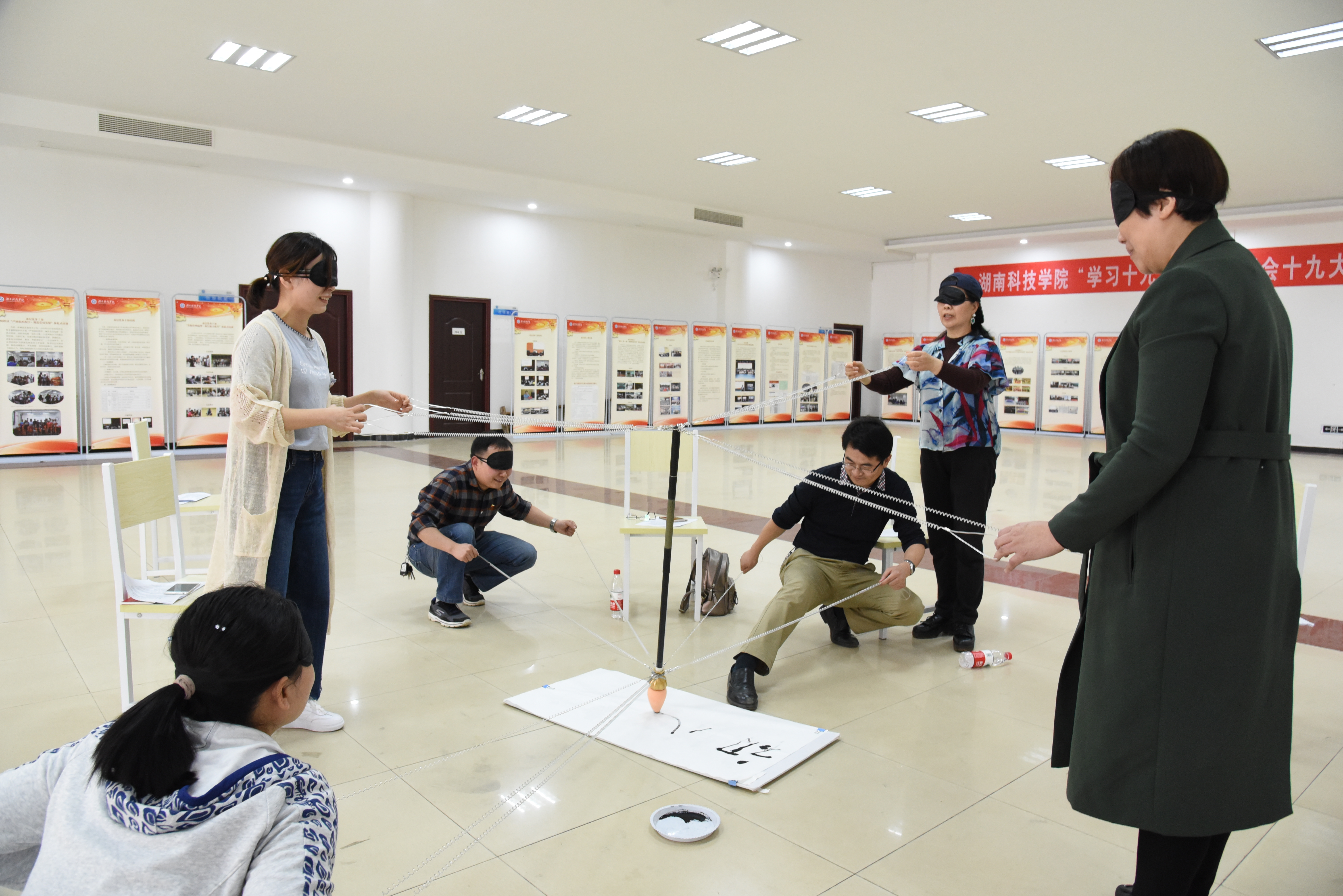 在热身环节中,党员同志们对“十九大为什么要修改党章?”“党章修改工作有什么特点?”“党章修正案哪天生效?”等问题进行了重温。在对号入座环节中,党员同志们通过将盘子里的条块放入题板前下方相应的格子里的方式学习了党章历史沿革。在说明理由环节中,党员同志们随机抽取党章修改的十个方面内容题目,在规定的时间内讨论并分享答案,检验大家学习党章修改的十个方面的效果。在蒙眼写字环节中,党员同志们围绕随机抽取题目展开讨论,并概括出关键词,戴上眼罩在队长的指挥下共同将关键词写在纸上。