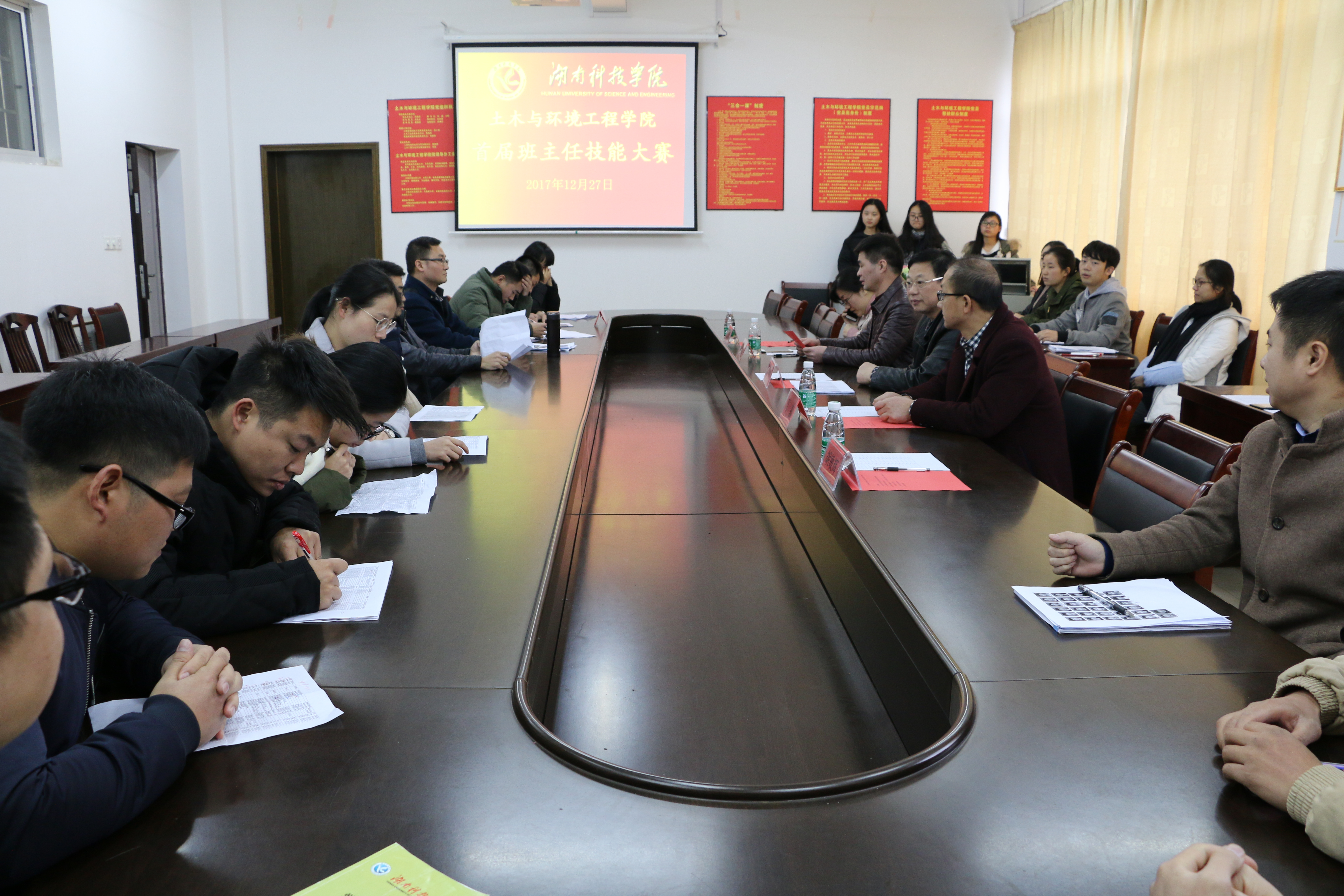 本网讯  为深入贯彻落实党的十九大精神和习近平总书记在全国高校思想政治工作会议上的重要讲话精神,12月27日下午,土木与环境工程学院举行首届班主任技能大赛,该院17名班主任参加竞赛。该院党总支书记张俭民、学工部部长唐华山出席。