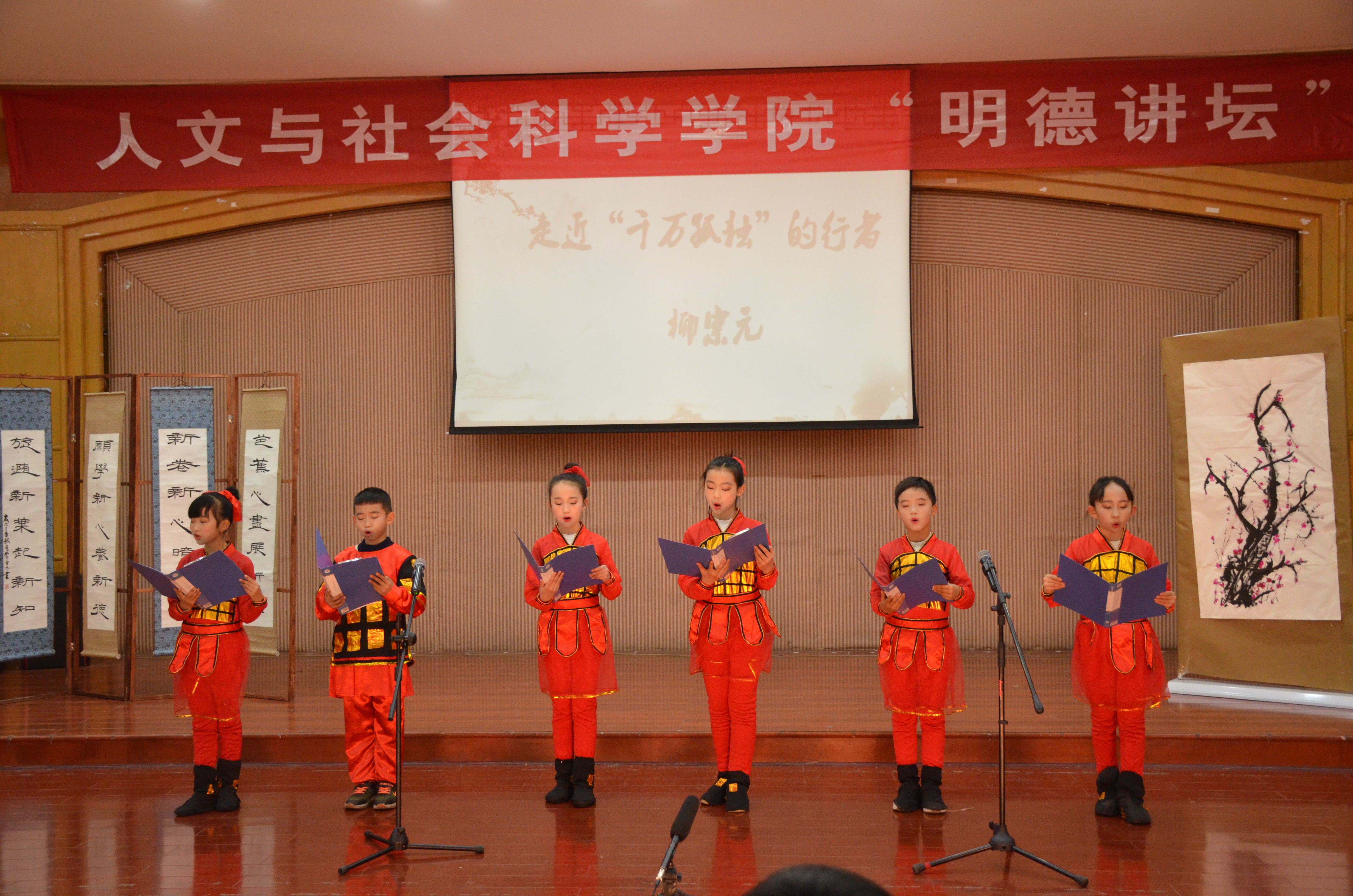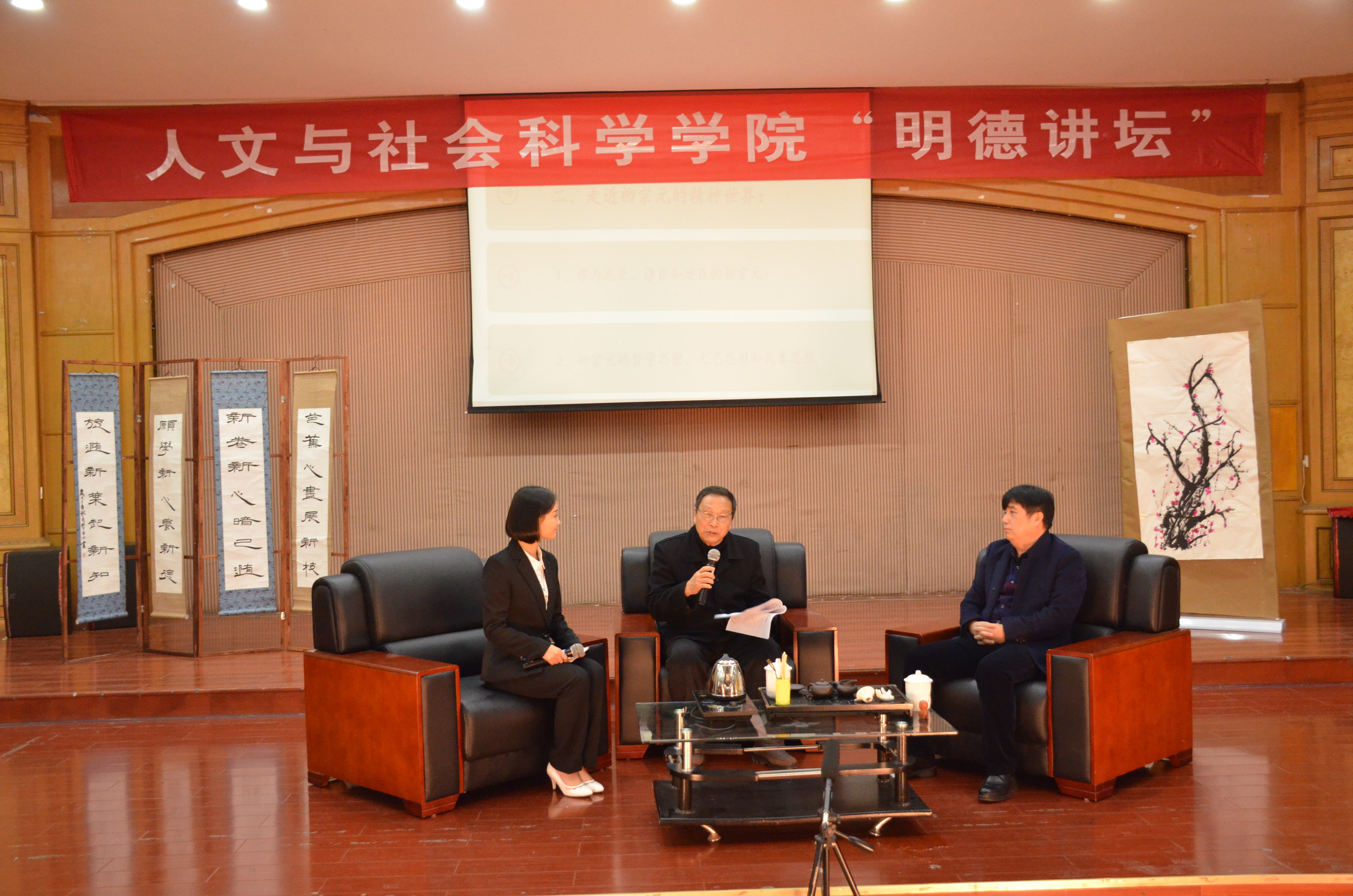 本网讯 12月23日下午,人文学院在明德楼二楼报告厅举行明德讲坛第六讲——“走近‘千万孤独’的行者柳宗元”。教育学院院长杨再喜教授、永州市柳宗元研究学会常务理事吴同和先生受邀担任本次主讲嘉宾,人文学院院长潘雁飞、党总支书记谷显明,永州市柳文化研究专家蔡自新、翟满桂莅临本次讲坛。