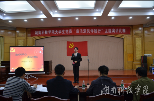本网讯(通讯员 王佩莹 唐议侦)为进一步强化我校党风党纪教育, 10月25日晚,由学校组织部主办,人文与社会科学学院第三党学生党支部承办的“廉洁清风伴我行”主题演讲比赛举行。副校长程智开出席。