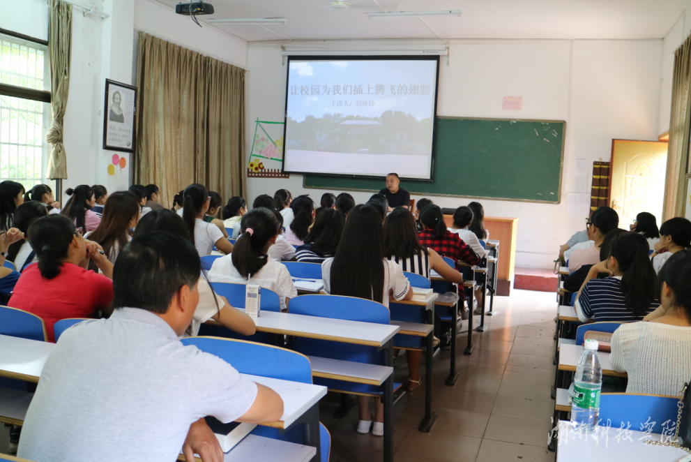 永州市检察院原党组副书记、副检察长、我校78级校友付玲玲以“让校园为我们插上腾飞的翅膀”为主题向同学们讲述了毕业后的工作历程,他以学长的身份,告诉同学们要学好哲学,运用辩证法的原理去学习和生活,提高情商和智商,培养自己独自生活的能力。