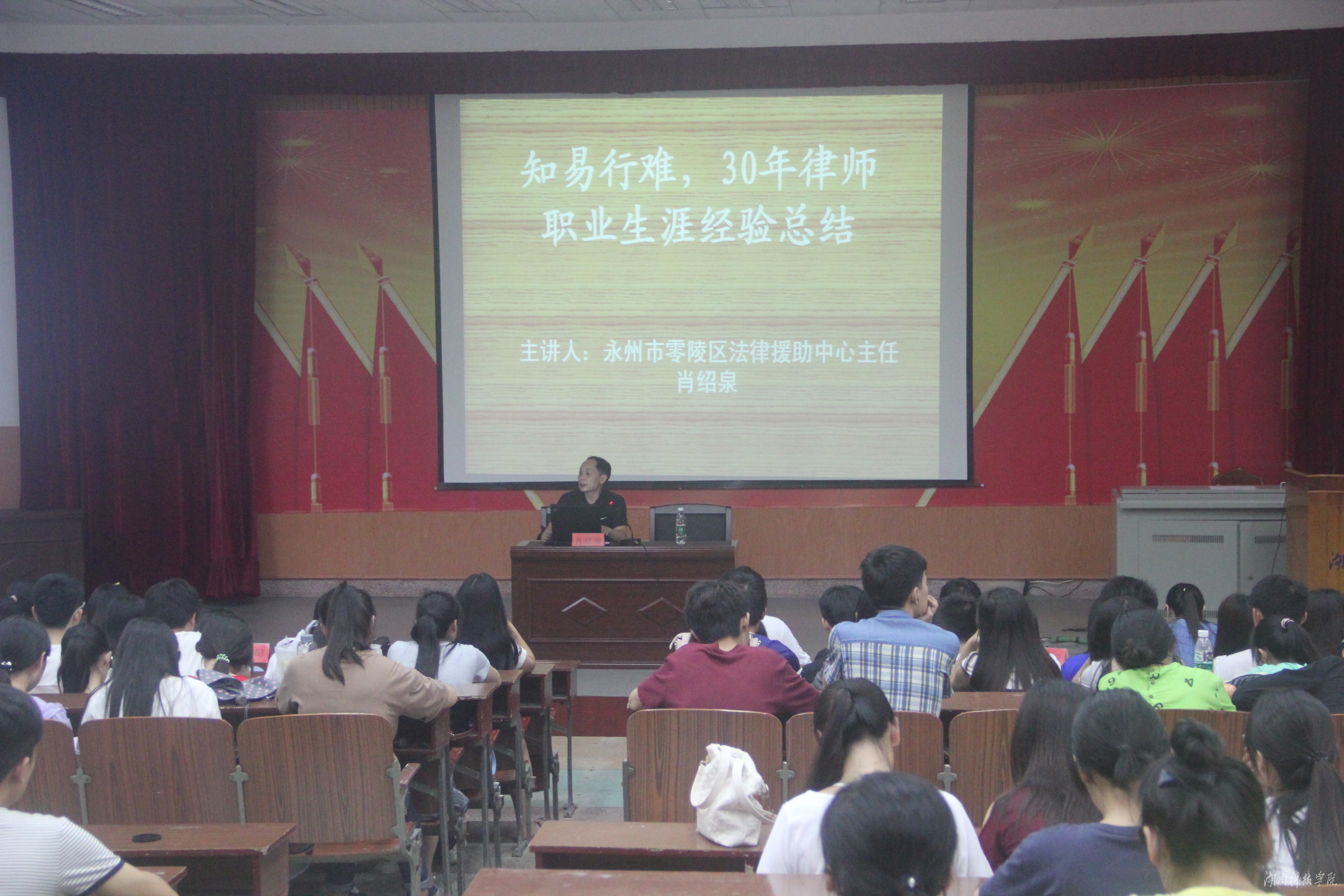 本网讯(通讯员 钟卫香)6月12日下午,永州市零陵区司法局法律援助中心主任肖邵泉应邀在明德楼报告厅作题为“知易行难,30年律师职业生涯中的技术与经验总结”的讲座,人文与社会科学学院法律系师生聆听学习,该院副院长李茂久主持讲座。