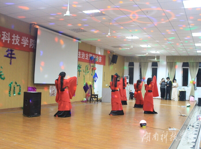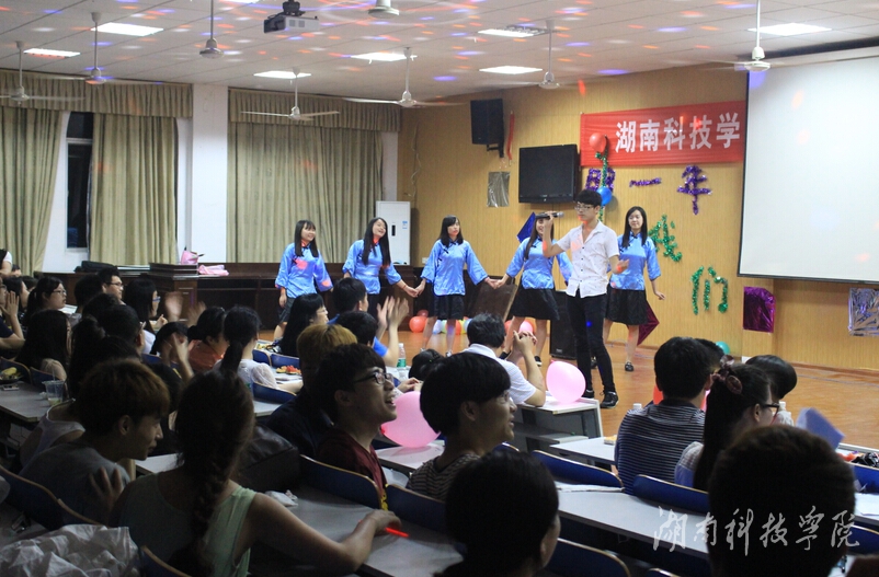 晚会节目形式多样。动感十足的爵士舞火爆开场,点燃了在场同学的热情,机械舞、小合唱、单人曲等节目彰显出大学生们的青春活力。师生互动节目《我爱记歌词》将晚会推向高潮。杨能山和廖雅琴一曲华尔兹让同学们赞叹不绝。来自该院的四位老师,以一支热舞《小苹果》赢得大家的阵阵掌声。