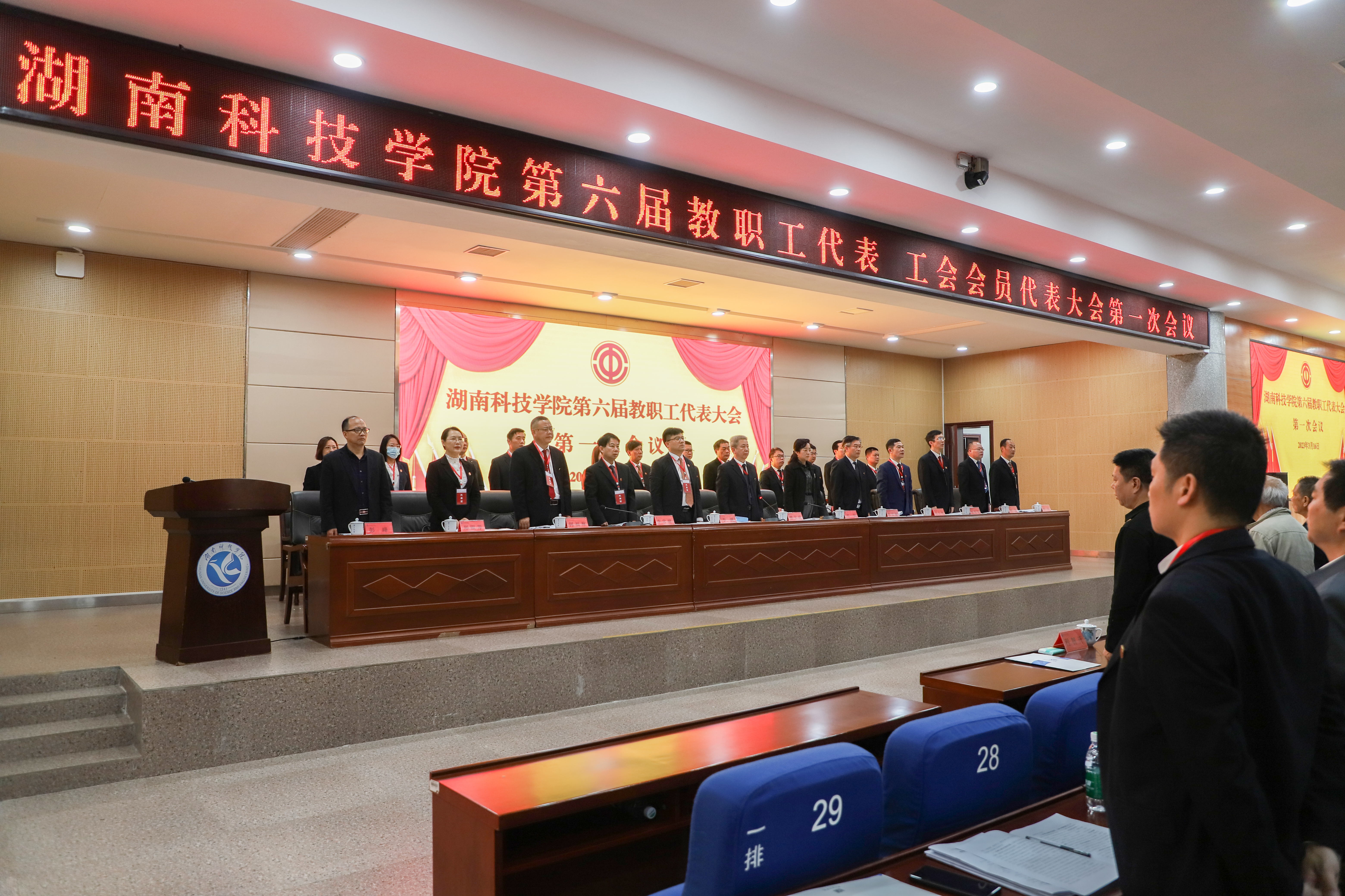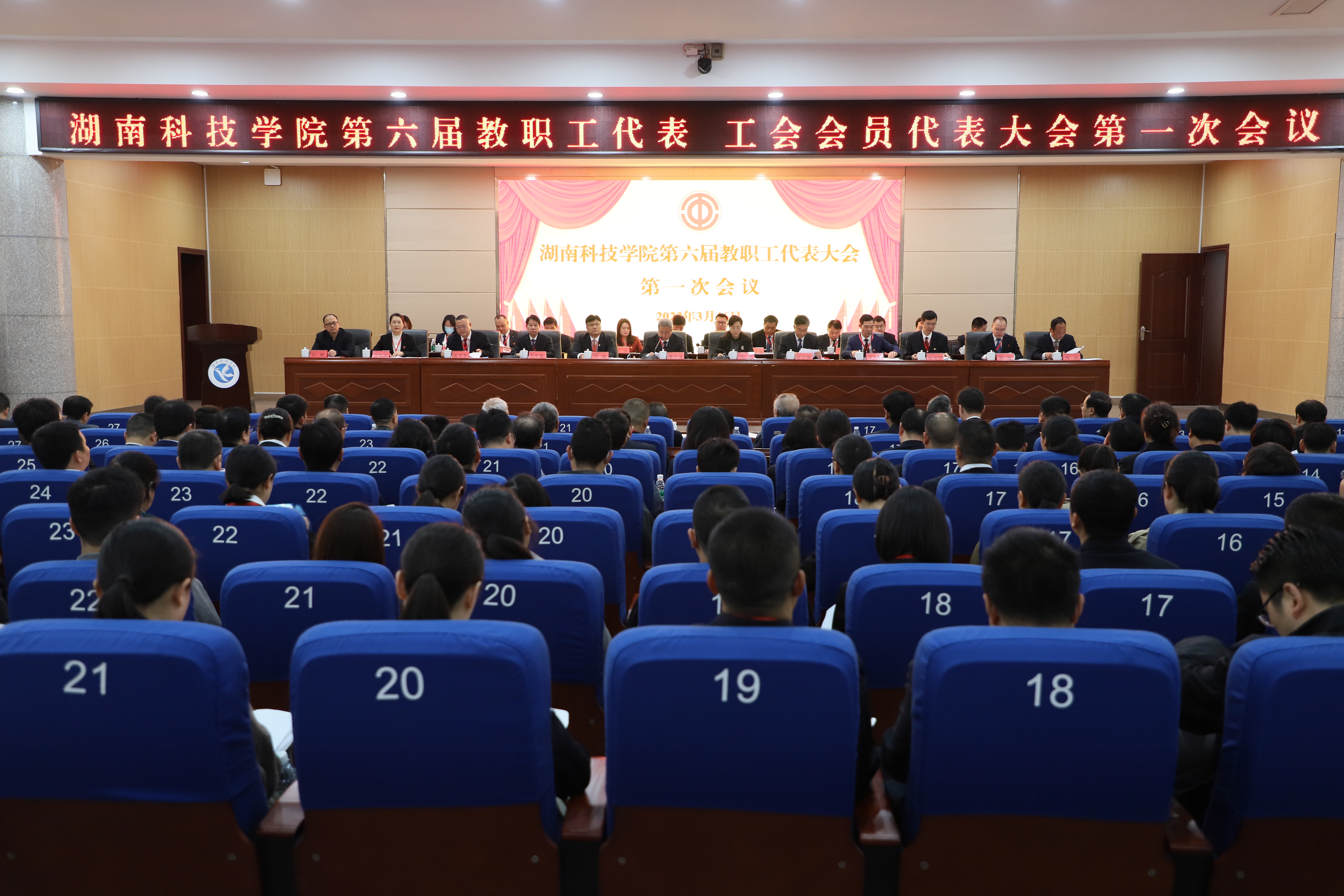 本网讯(记者 余佳佳)3月16日,我校第六届教职工代表、工会会员代表大会第一次会议在潇湘大讲堂隆重开幕。湖南省教育工会副主席邓曼,湖南省教育工会高教部部长彭峰,党委书记曾宝成,党委副书记、校长李钢,校领导宋宏福、李常健、吴小林、何福林、陈灿军、郑银芳、何海,党委委员、组织部部长杨涛,全体代表、特邀嘉宾和列席代表207人齐聚一堂,共同商讨学校发展大计。
