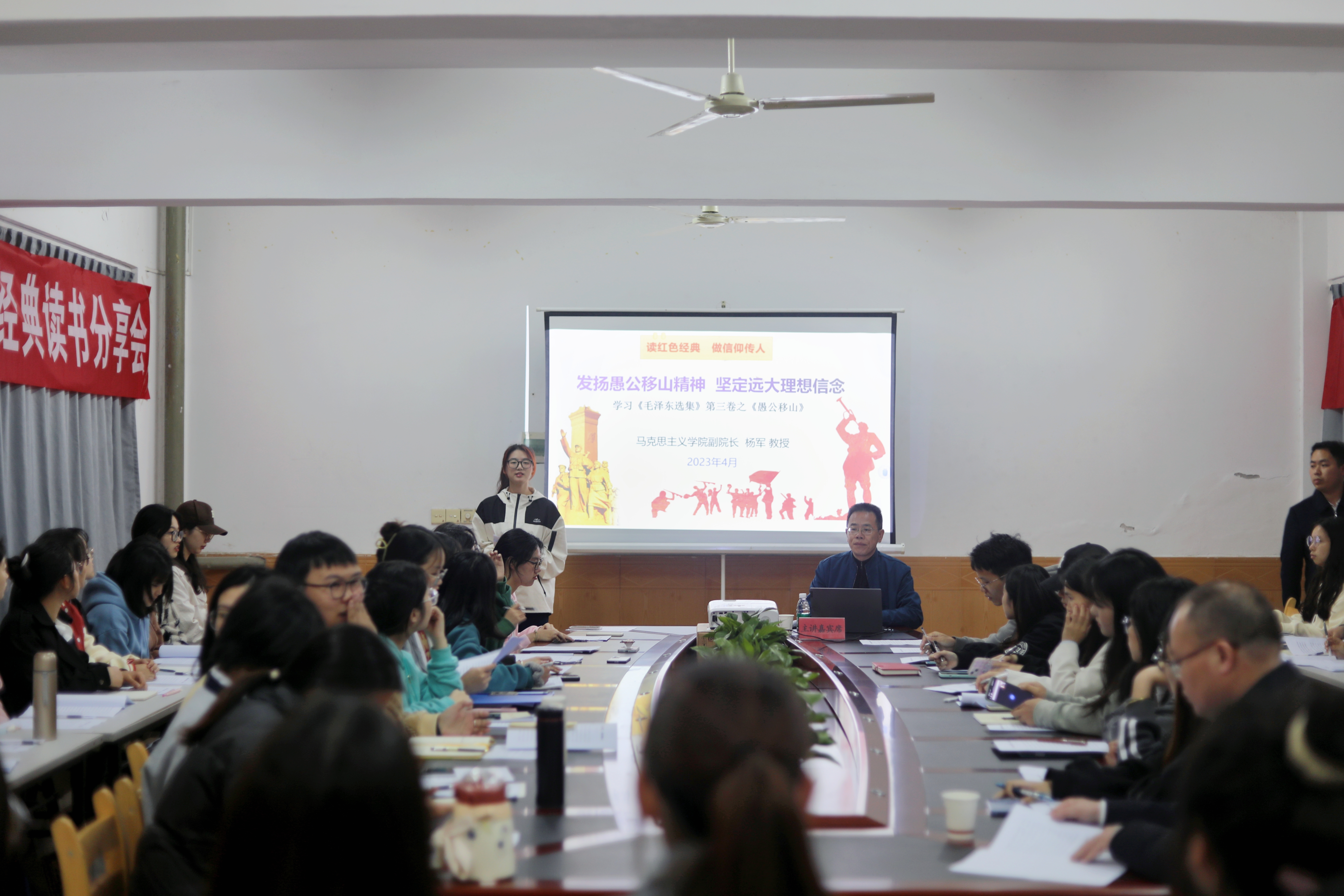 马克思主义学院副院长杨军为学生们分享了红色经典《毛泽东选集》第三卷,重点讲授其中的《愚公移山》。他从作品概况、作品背景、内容品读与时代价值等四个方面引经据典,侃侃而谈,为学生们铺陈叙述了抗日战争期间中国共产党浴血奋战、艰苦奋斗的恢宏史诗,并结合当前深刻变化的国际战略形势,号召同学们正视奋斗路上的困难与波折,展现新时代奋发进取的精神风貌。