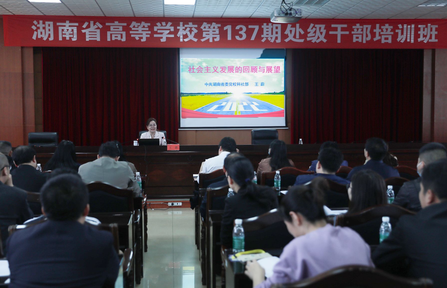 本网讯(记者 周秋珍 陈伟琳)5月20日,湖南省高等学校第137期处级干部培训班暨星空app官网处级干部培训班第三、四课开讲。省政协常委、省政协学联委副主任孔和平,省委党校科学社会主义科研部副主任、教授王蔚来校授课。