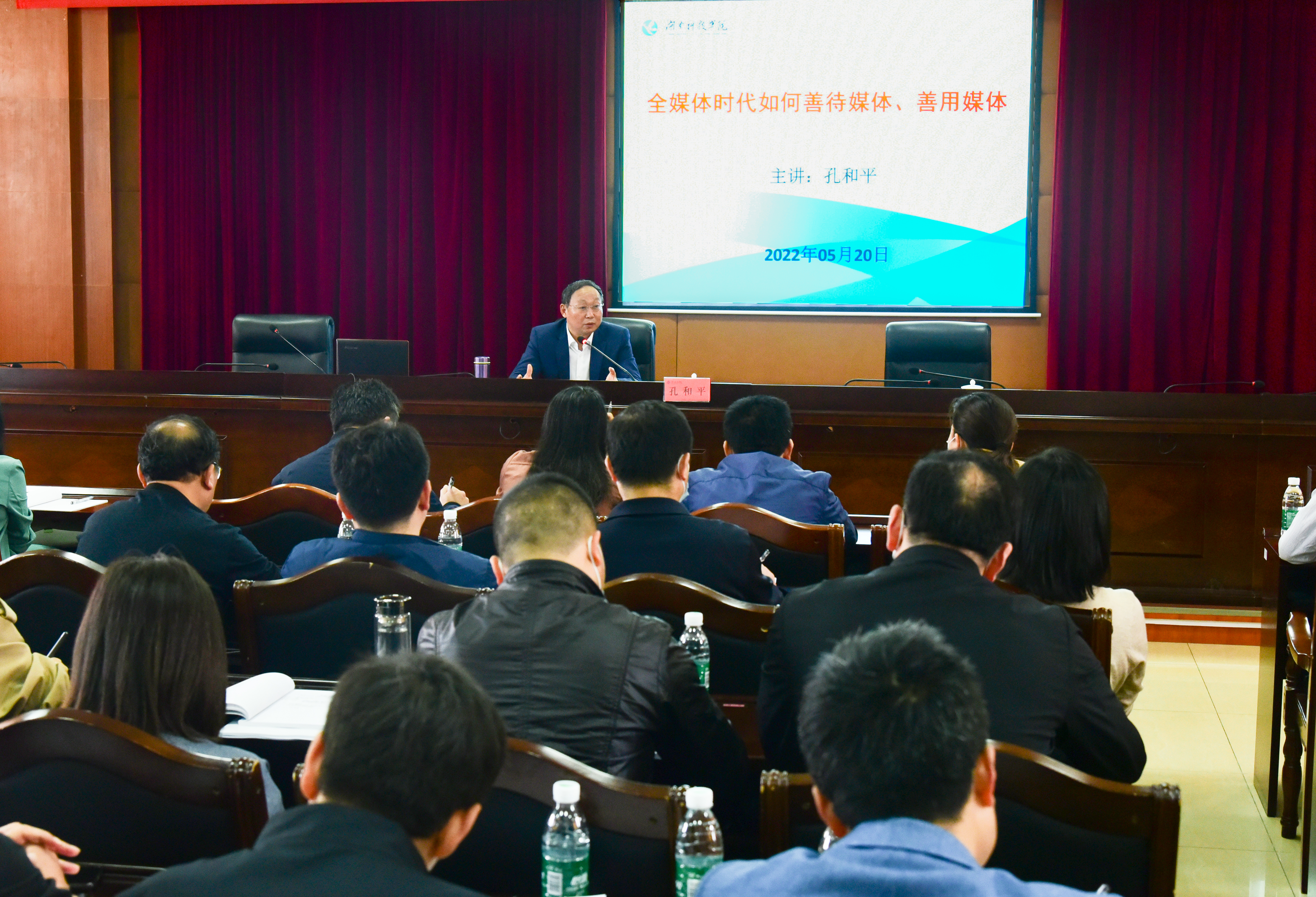 孔和平作《全媒体时代如何善待媒体、善用媒体》专题讲座。他结合长期从事新闻宣传和舆论引导的工作经验,以大量实例,深入介绍了全媒体时代的内涵、特点和形势,从回答记者提问常识性要求、如何应对记者提问两方面详细讲述了高校领导干部与媒体沟通的方法和技巧、应对媒体采访的要领和对策、应答媒体敏感性提问的方式和举措。他强调,高校与媒体交流时,特别是就一些重大事件接受采访时,应该按照及时准确、公开透明、有序开放、有效管理的要求,严格执行及时性、定时性、有利性、引导性、统一性五大原则,及时发布权威信息,公布事实真相,全面客观地介绍事件进展情况、重要举措和防范措施,正确引导社会舆论,维护学校形象,维护广大师生的根本利益。