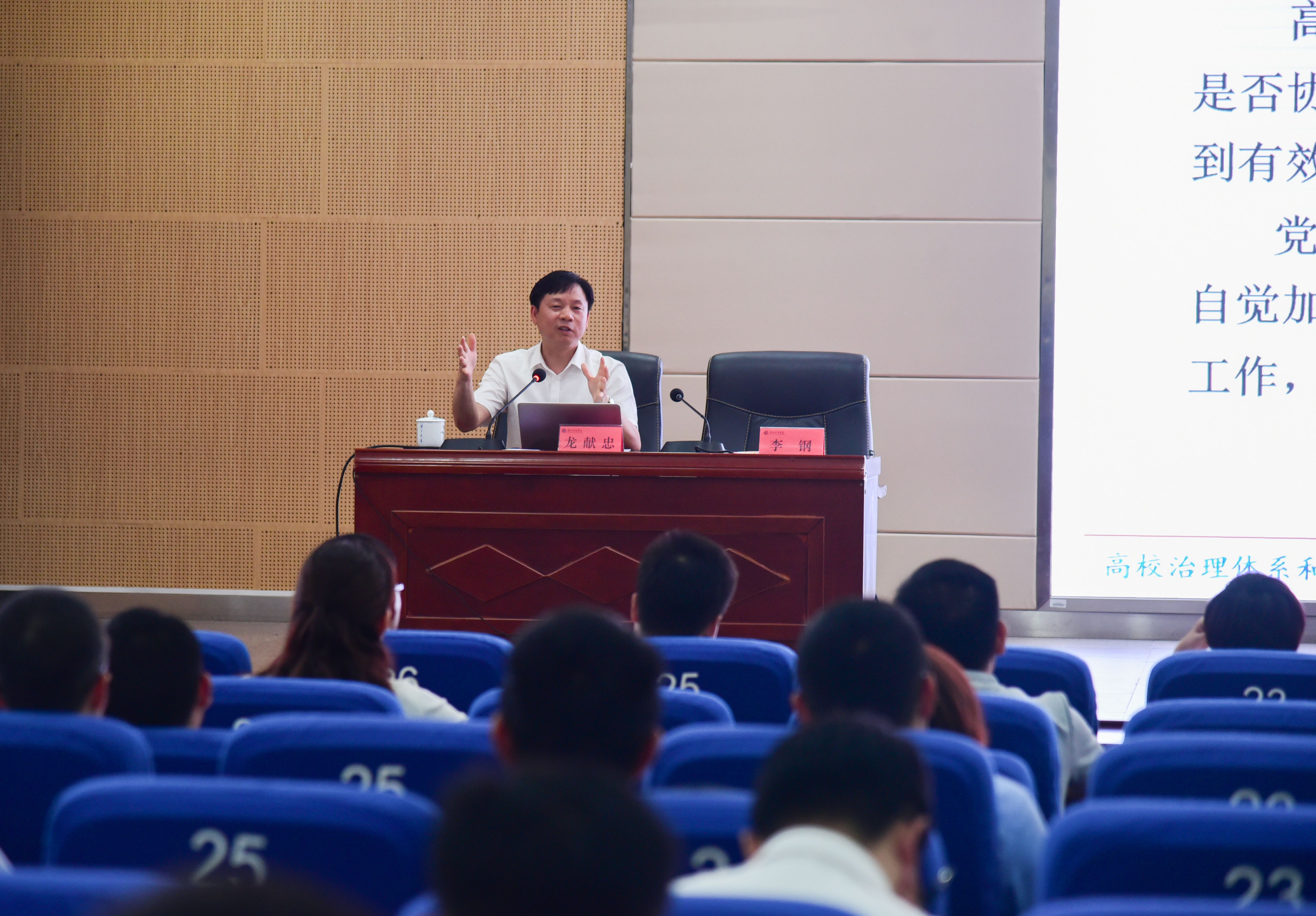 龙献忠指出,要突出高校政治服务的主导地位,按照习近平总书记指示精神:高等教育要为人民服务,为中国共产党治国理政服务,为巩固和发展中国特色社会主义制度服务、为改革开放和社会主义现代化建设服务。他强调,人的现代化是高校治理能力现代化的核心,勉励大家从“政治”“利益”“忠诚”“能力”“学习”“精神”“团结”七个方面促进人的现代化。