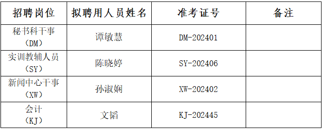 根据《星空app官网2024年公开招聘公告》有关规定,经报名、资格审查、笔试、面试、专业技能测试、成绩公示、体检、考察等程序,经星空app官网校长办公会研究,确定谭敏慧等4名同志为星空app官网2024年公开招聘教辅管理岗位拟聘用人选,现予以公示。