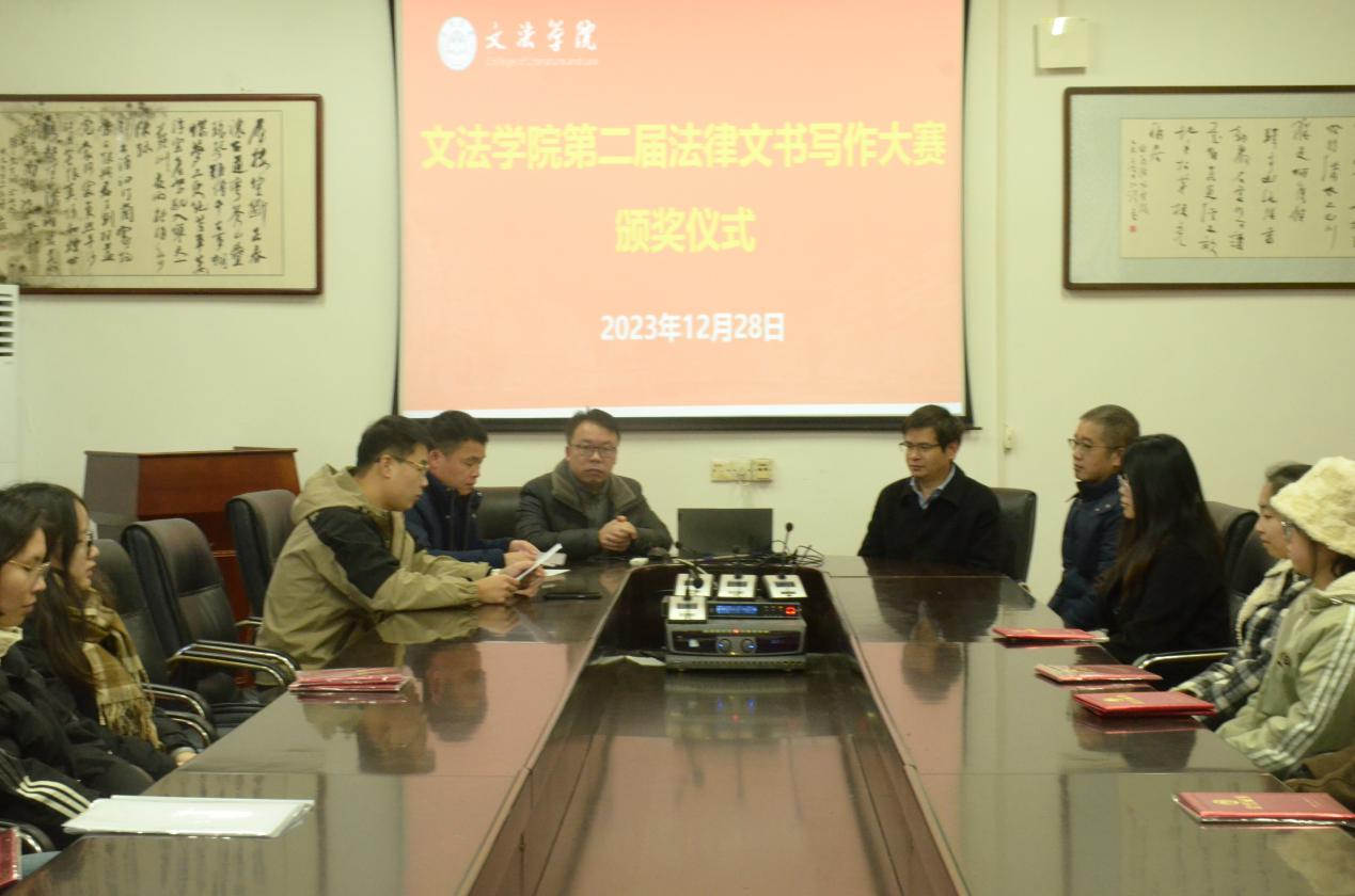 本网讯(通讯员:蒋梦娟)12月28日,文法学院第二届法律文书写作大赛颁奖仪式在明德楼会议室207召开,参与本次仪式的有文法学院院长谷显明、党总支书记张能泉、副院长肖智成、副院长包红光、法学系主任肖文涛及获奖同学。