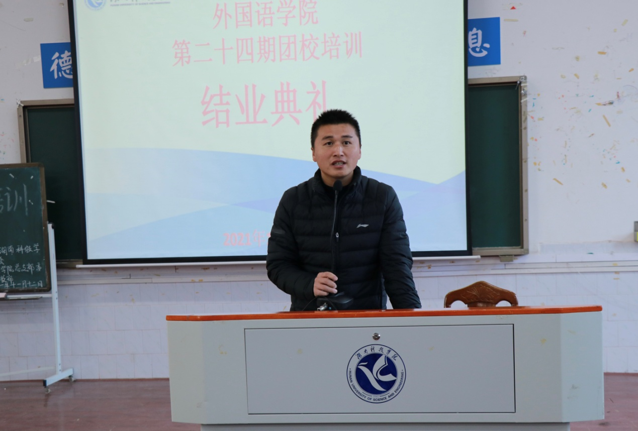 随后,刘罗为本次结业典礼致辞,他希望此次参加团校培训的学员能够奋发向上,体现共青团员的修养,并强调学生干部更应承担责任,以身作则。最后,刘罗祝愿全体学员学习进步,心情愉快,同时他也希望在院党培、校团培及校党培训中见到大家。