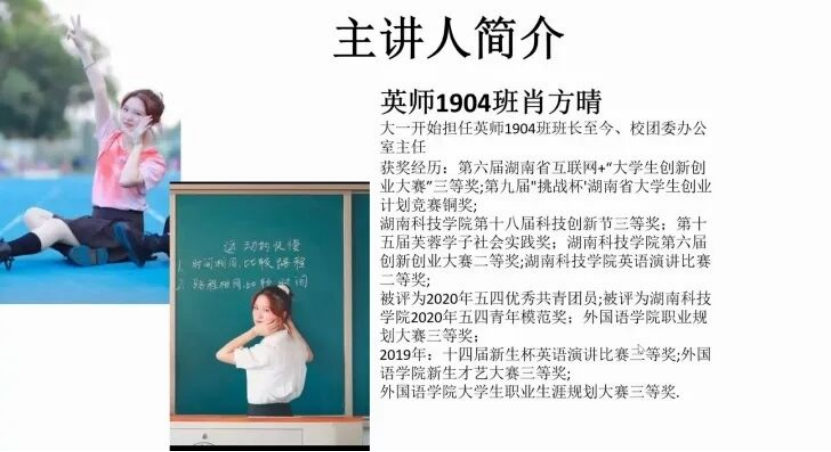 本网讯(通讯员 文慧聪)2月20日晚7:00外国语学院在腾讯会议APP线上展开了以“我敢闯,我会创”为主题的第五十九期“菁菁学子讲坛”。英语师范1904班肖方晴、 英语师范1902班吴曼应邀参加此次活动。全院210多名同学主动报名参加。
