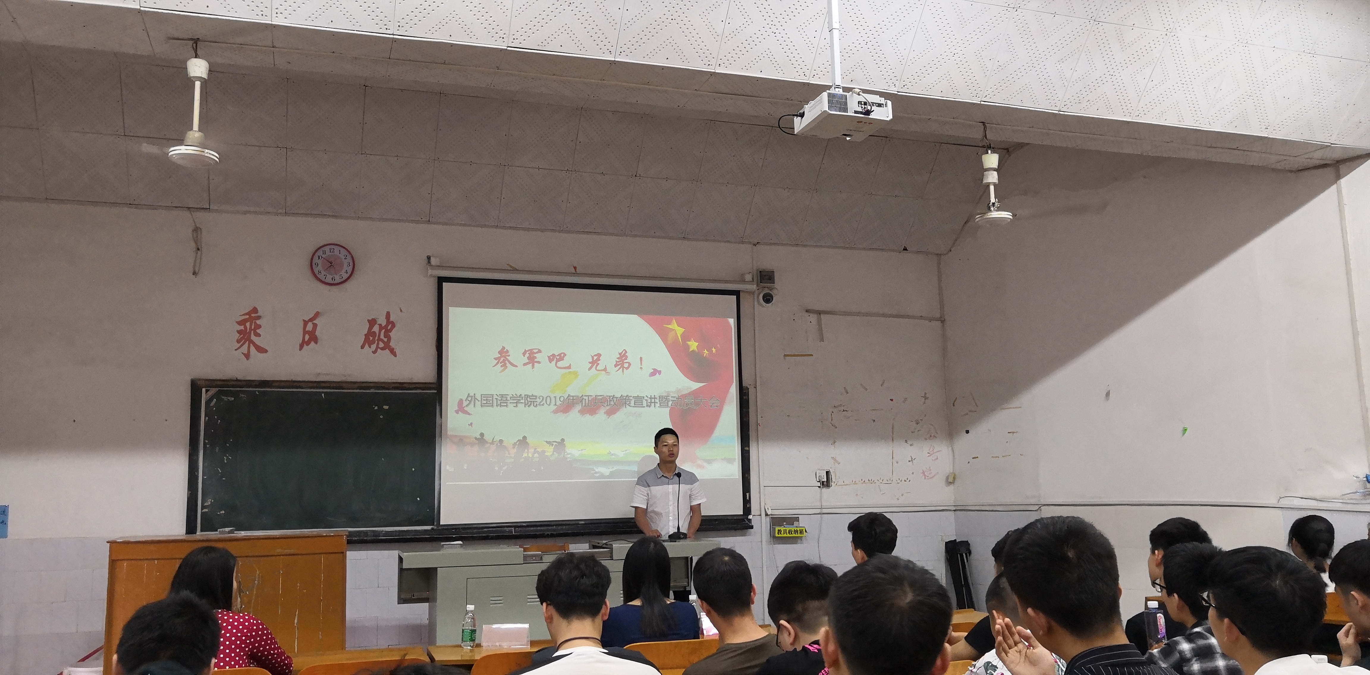 本网讯(通讯员 郑云华建功新时代,青春献国防。4月26下午,外国语学院2019年征兵政策宣讲暨动员大会在博雅楼东1-1召开。外国语学院党总支副书记、副院长罗晶;18级辅导员王素芳老师;17级辅导员杨佳;我校退役复学的经济与管理学院统计学1601班谌明江同学和电子与信息技术学院通信工程1601班许收同学以及我院各年级有参军意向的同学出席本次会议。大会由王素芳老师主持。
