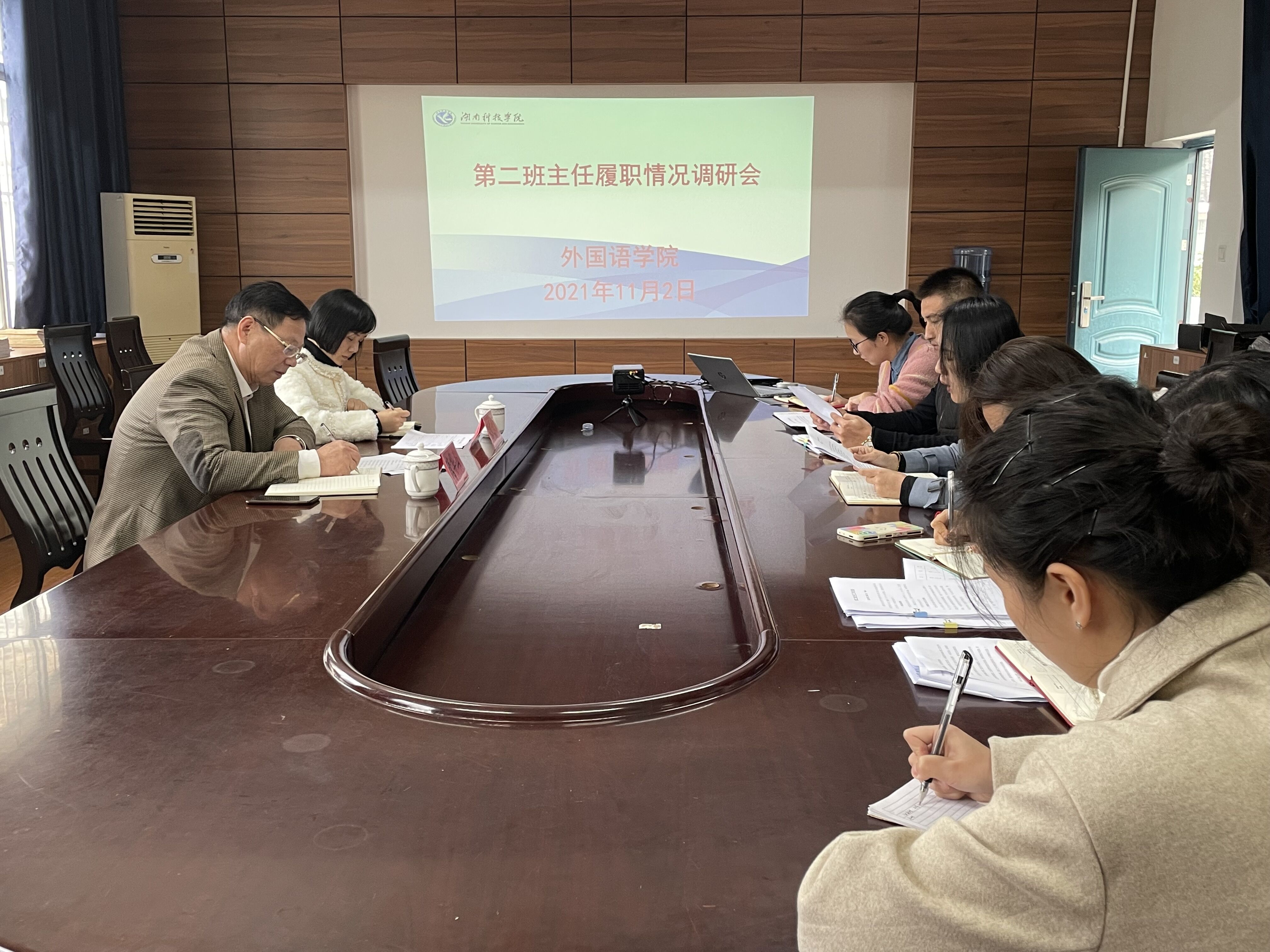 11月2日下午16点30分,在博雅楼202会议室,外国语学院召开第二班主任工作履职情况调研会。学工部部长唐华山、学工部思政办副主任吕文青莅临指导,外国语学院党总支副书记罗晶、全体辅导员、第二班主任代表蒋秋林、学生代表刘小佳参加会议,会议由罗晶主持。