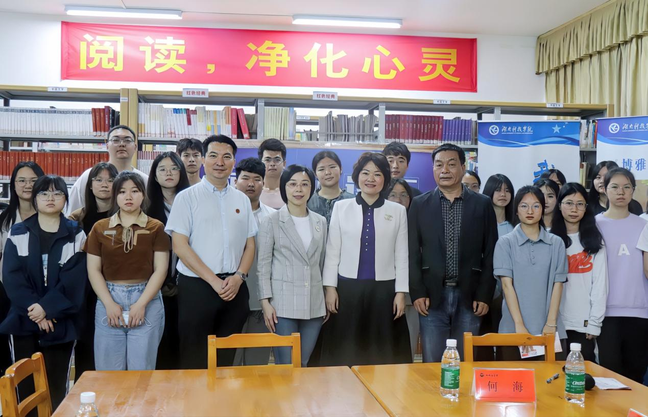 (通讯员 旷湘怡 摄影 金雪荣)5月6日上午8:30,外国语学院于图书馆104综合阅览室开展了第十期博雅阅读汇暨“书香外院”启动仪式。党委委员、副校长何海,图书馆馆长郑际根,外国语学院院长何丽萍,外国语学院党总支书记唐君应邀出席。本期邀请到的嘉宾是英语专业1995届校友、党的二十大代表、教授、博士、注册心理师,现任中南林业科技大学心理健康教育研究中心主任袁红梅。全院共有40名同学参加此次活动。