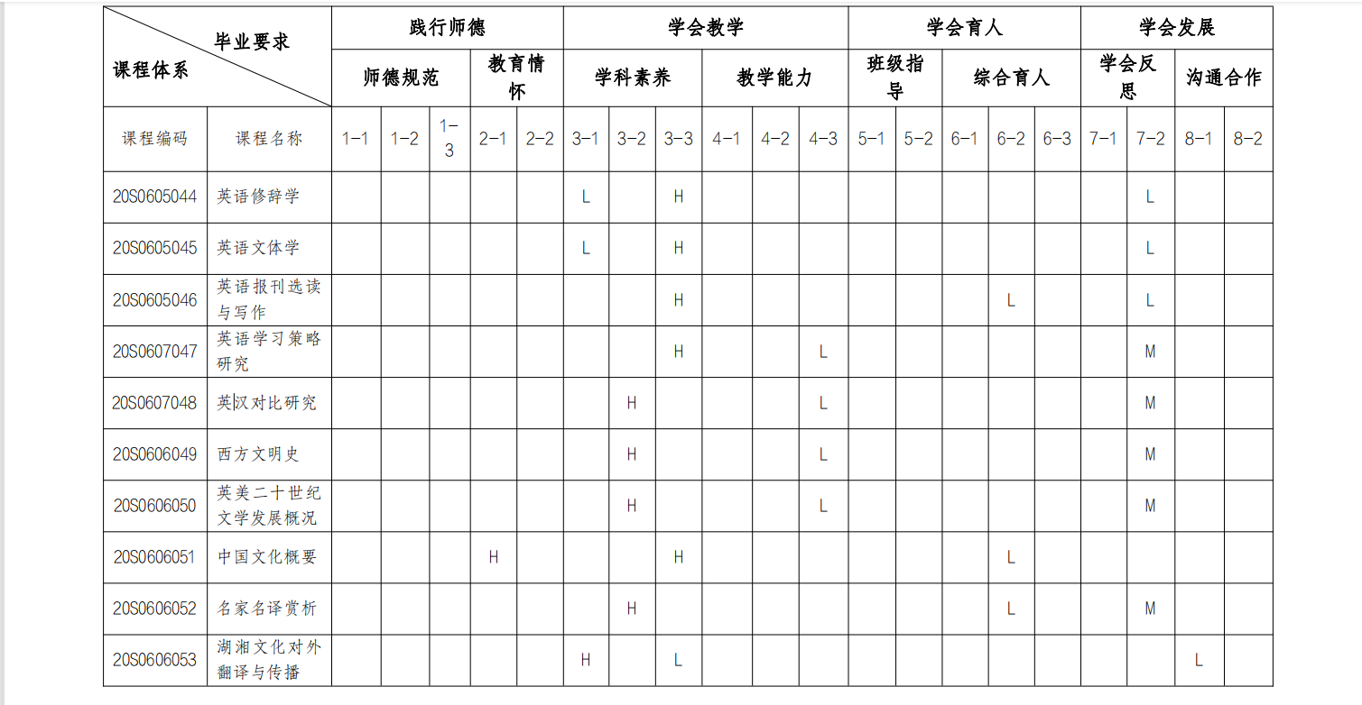注:根据毕业要求与课程目标、课程内容与课程目标的对应关系编制本表,“课程体系支撑毕业要求实现关系矩阵”应覆盖所有 必修环节,开设各课程(理论课程、实践课程)应对毕业要求达成具有一定支撑作用。根据课程对各项毕业要求的支撑强度分别用“H (高)、M(中)、L(弱)”表示,支撑强度的含义是:该课程覆盖毕业要求指标点的多寡,H 至少覆盖 80%,M 至少覆盖 50%,L 至 少覆盖 30%。不必全部支撑,不可能全部支撑,须明确高支撑。