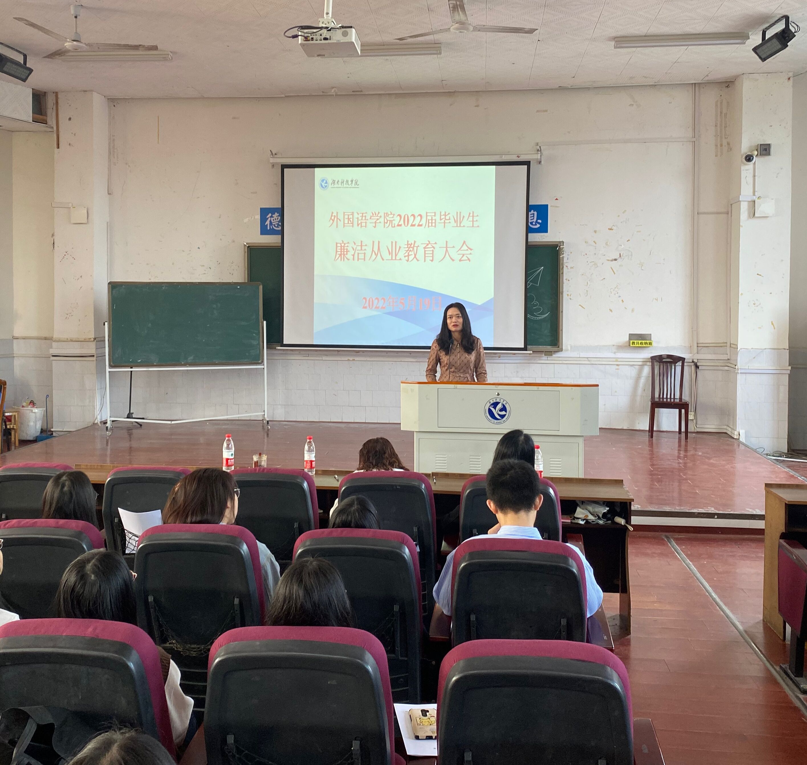 本网讯(通讯员 邱声金 摄影 刘嘉怡 王梦思)为进一步加强毕业生廉洁自律意识,5月19日上午,学院组织召开2022届毕业生廉洁从业教育大会。学院院长欧华恩、党总支书记张剑、党总支副书记罗晶出席会议,会议由2018级辅导员王素芳主持。