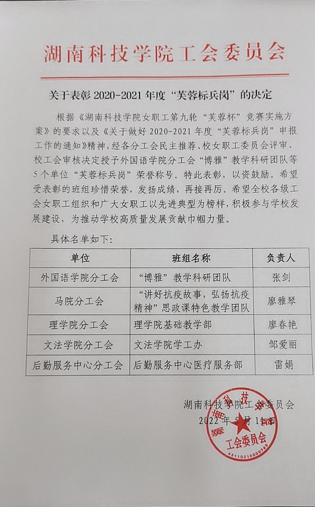星空app官网关于表彰2020-2021年度“芙蓉标兵岗”的决定