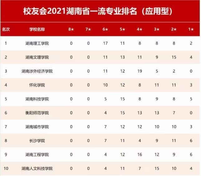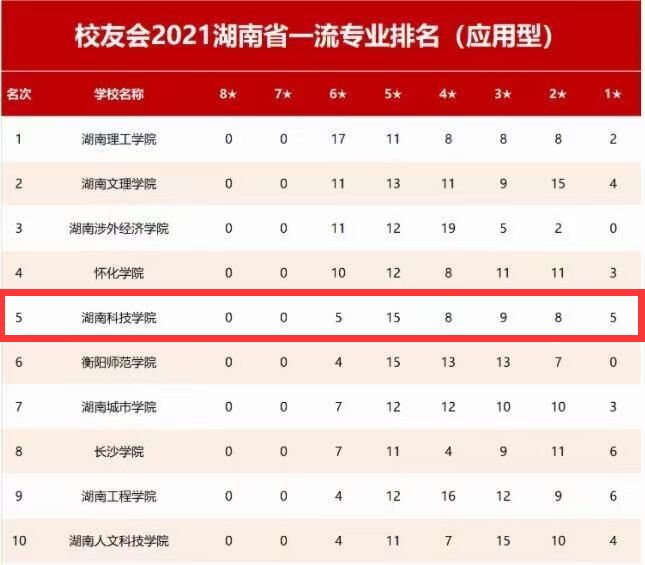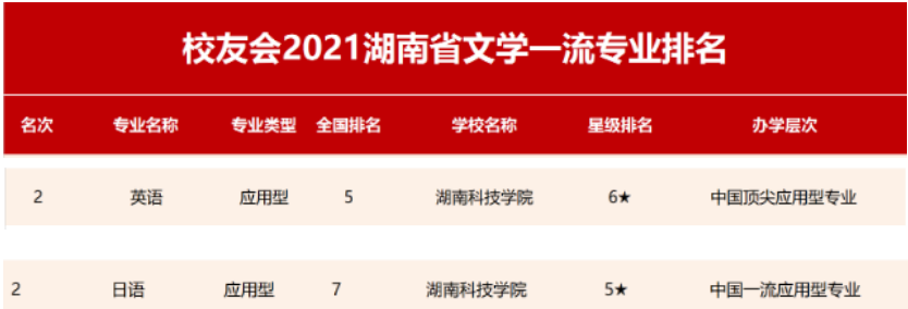 本网讯 由全国第三方大学评价机构艾瑞深校友会网(http://cuaa.net/)独家撰写、科学出版社正式出版发行的《2021校友会中国大学排名—高考志愿填报指南》最新发布2021校友会中国一流专业排名、2021湖南省一流专业排名和2021湖南省各学科门类一流专业排名。在2021湖南省一流专业排名(应用型)中,我校位居第5。外国语学院英语专业在全国排名第5,为“六星”级专业(中国顶尖应用型专业);日语专业在全国排名第7,为“五星”级专业(中国一流应用型专业)。