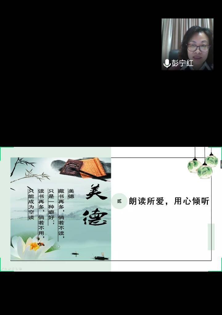 本网讯(通讯员 彭芳婷 李政锴)“齐心抗‘疫’,停课不停学”。4月15日晚,外国语学院通过腾讯会议app开展 “博雅悦读汇” 线上读书分享活动,外国语学院副院长彭宁红应邀分享, 200多名学生线上共享经典佳作。彭宁红主要从事应用语言学、二语习得研究,分管实践教学及各级各类学科竞赛。曾在英国爱丁堡大学进行短期访学,在美国旧金山州立大学进行短期培训研修。
