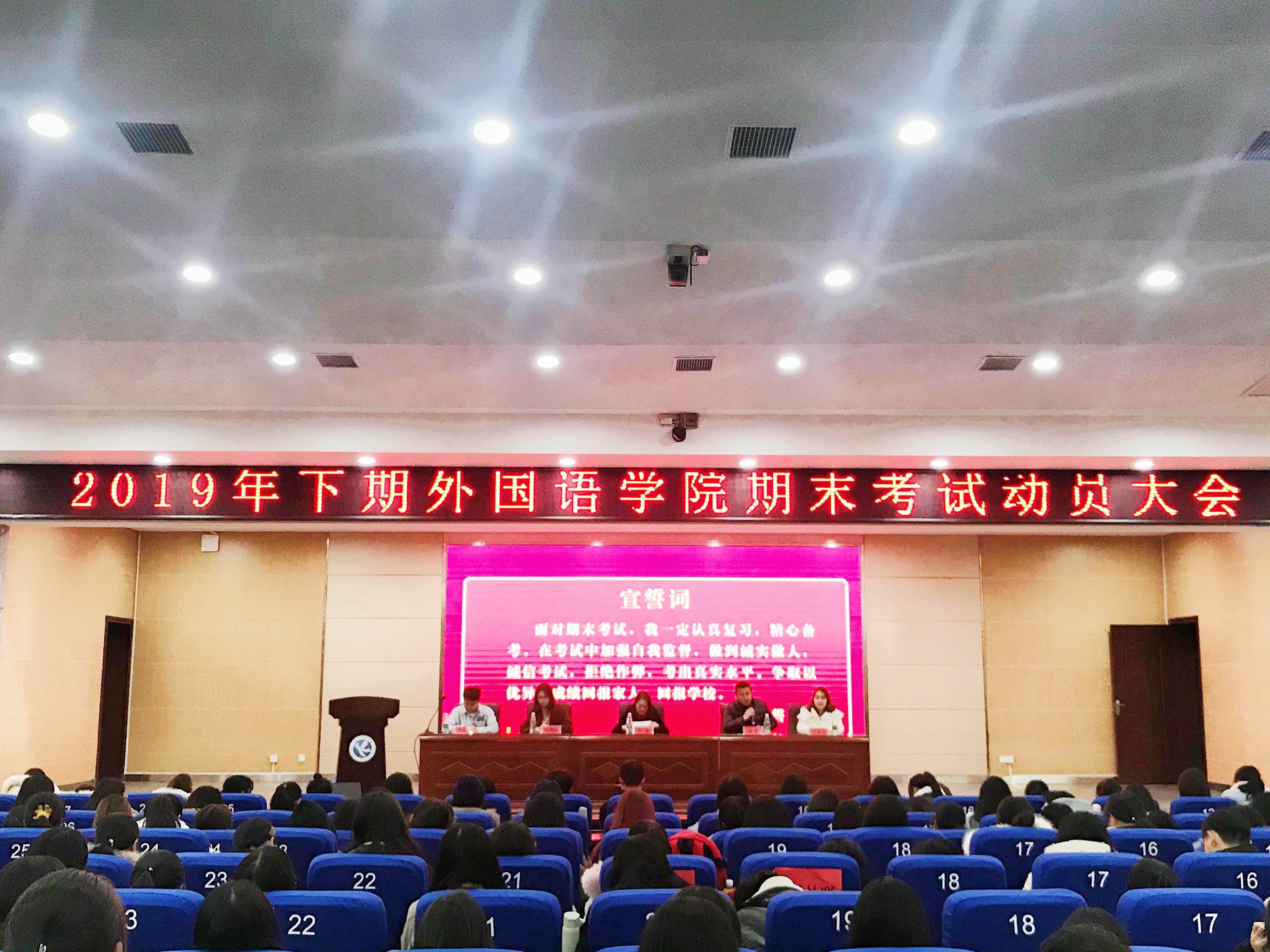 本网讯(通讯员 彭芳婷)临近期末考试,为增强校园浓厚学习氛围,建设良好的期末备考环境,敦促考风考纪建设,12月18日晚,外国语学院在潇湘大讲堂举行期末考试总动员大会。出席本次活动的有外国语学院党总支副书记兼副院长罗晶、16级辅导员唐鹤轩、17级辅导员刘罗、18级辅导员王素芳、19级辅导员李政锴以及大一、大二、大三全体学生。