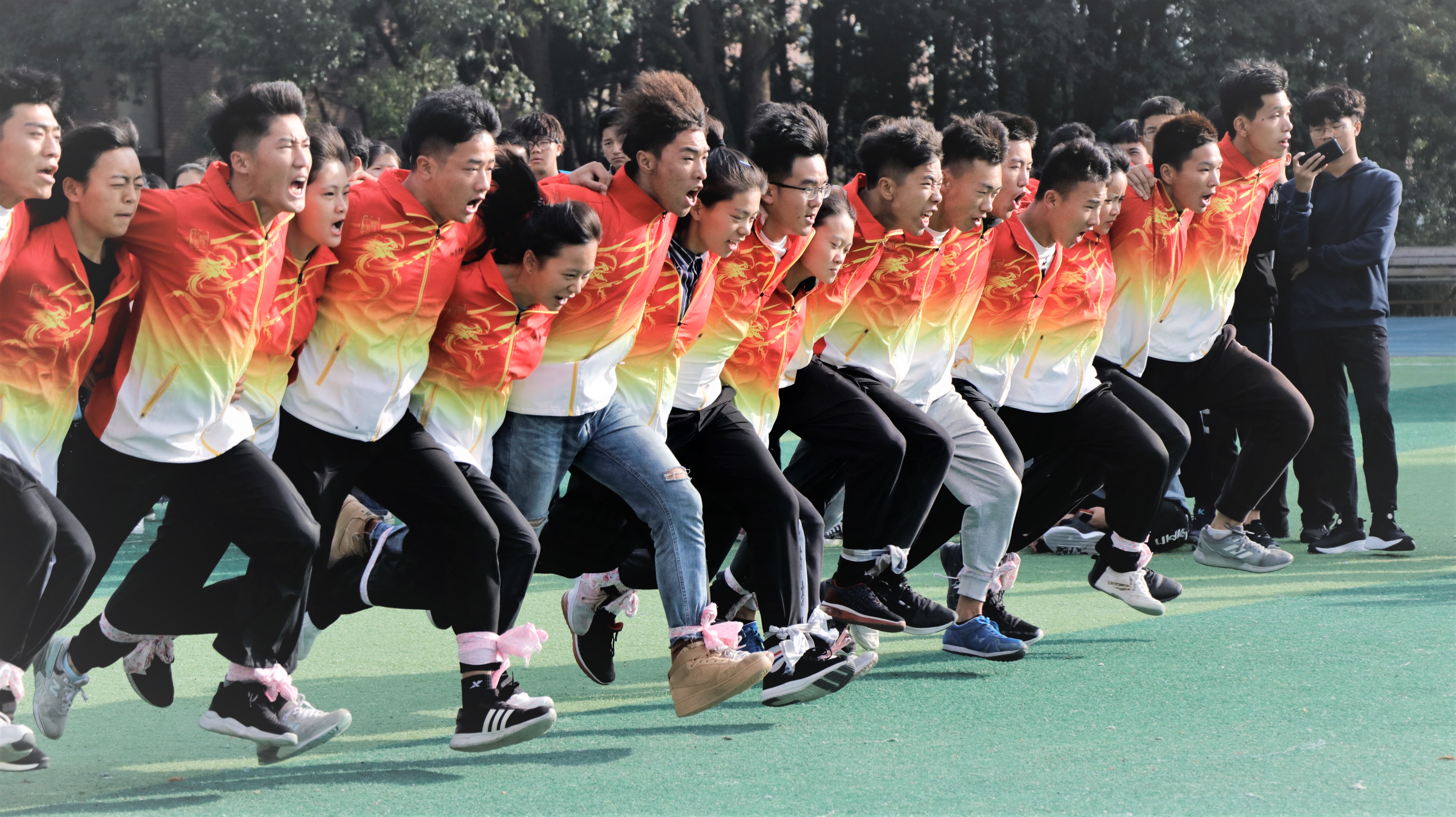 比赛开始的声音响起时,在翠绿的跑道上,在观众的呐喊声中,参赛队伍们团结一心,踏飒流星,用一根绳子系上了彼此的脚,也系住了羁绊,互相把着相邻队友的肩膀,一次又一次调整他们的步伐和节奏,努力争取“更稳,更快,更强”,迈着整齐的步伐,一步一步振奋人心,三十个身影犹如三十头并驾齐驱的野马为了同一个目标团结一心齐头并进,即使会有摔跤,会有受伤,但同学们也没有选择放弃,仍然站起来重整旗鼓,继续向前。现场气氛一度十分热烈,欢呼声、呐喊声在场上持续不断。