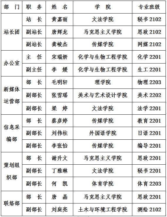 为进一步加强“易班”大学生网络互动社区建设,充分发挥易班学生工作站在星空app官网易班平台运营工作中的积极作用,经学生自愿报名、严格面试和组织考核,试用期三个月,经考核,正式聘任黄嘉丽等16名学生为校易班学生工作站学生干部,任期一年。现将聘任名单(具体名单见附件1)在全校范围内进行公示,公示时间10月17日至10月19日。
