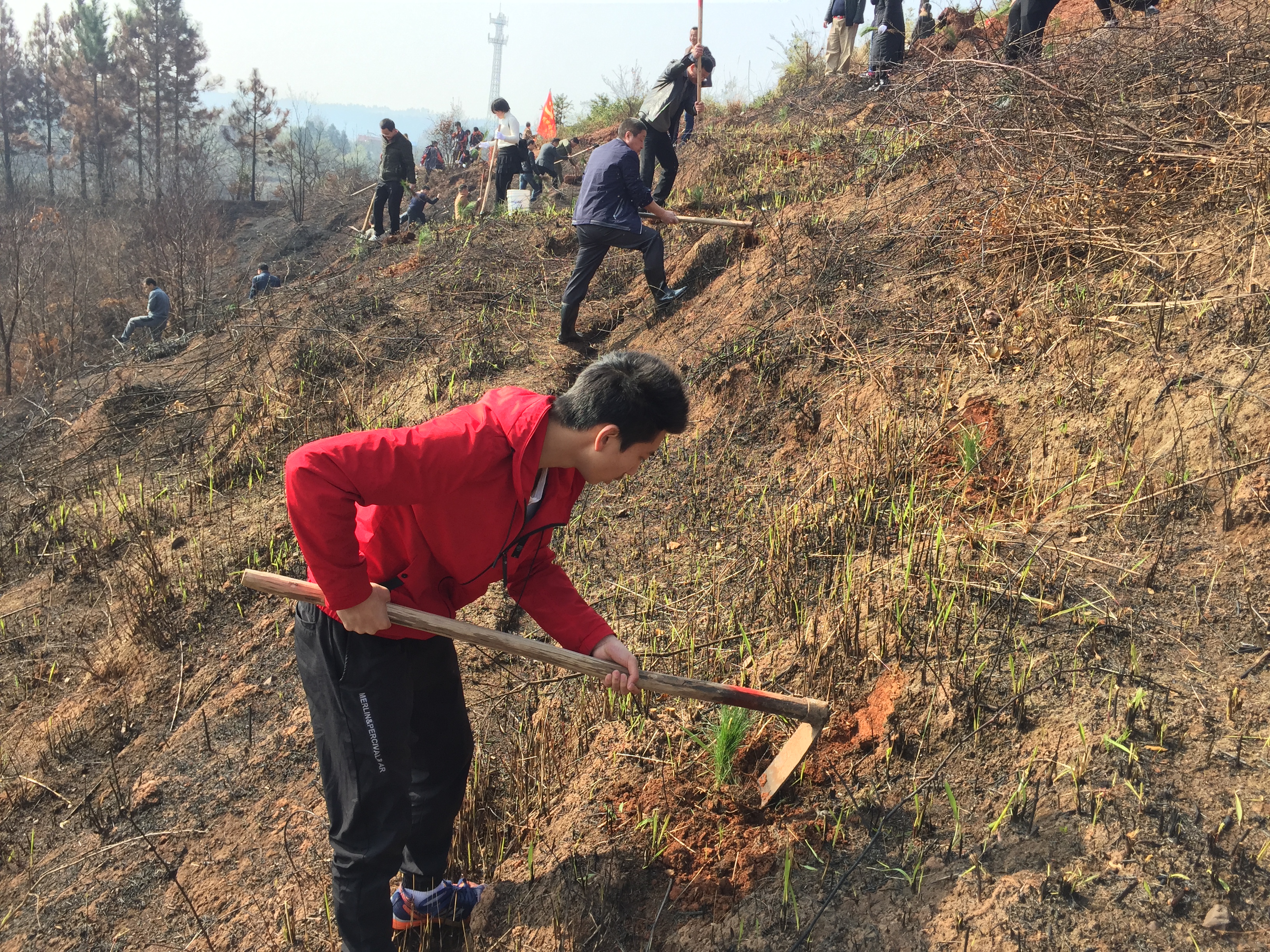 在植树地点,大家热情高涨、干劲十足,两人一组,分工合作,配合默契,有的挖坑、有的扶树、有的培土、有的浇水,每道工序有条不紊,到处一片热火朝天的劳动场景。每个志愿者脸上都洋溢着笑容,一个个树坑的挖成,一颗颗树苗的栽下,孕育着一份份绿色的希望;每一滴汗水的流下,每一铲泥土填充,则代表着每一个人的奉献和爱心。经过大家的奋战,400株松树苗种满山坡,一片荒山重新披上了绿色的新装。