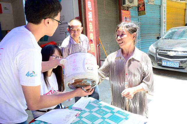 维修点刚布置好,一位大娘就抱来一个电饭煲:“这个电饭煲能不能修?”维修人员热情地接过电饭煲,马上为大娘拆开电饭煲找到故障并修好。