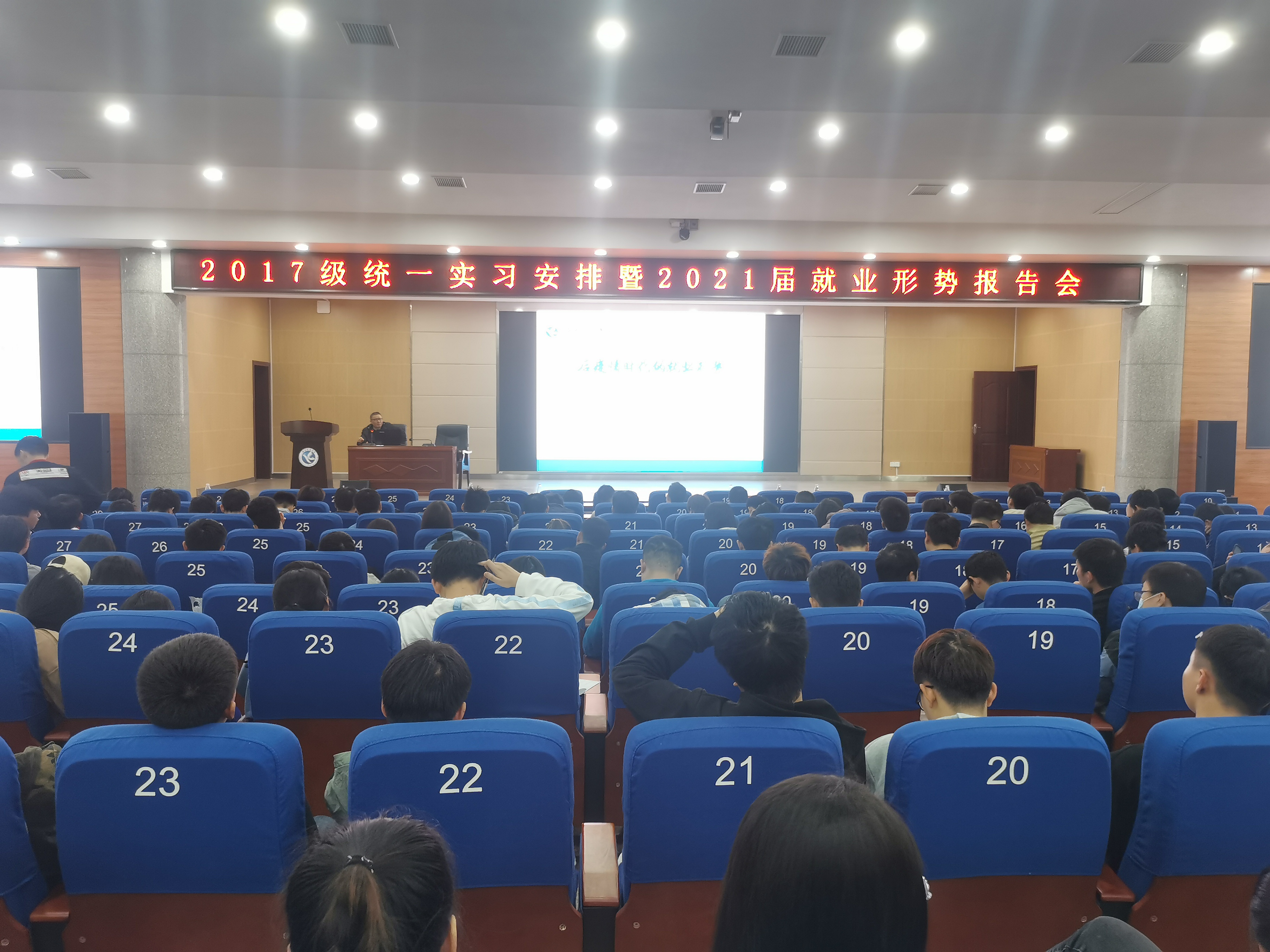 11月11日晚,电信院在潇湘大讲堂开展2021届就业形势报告会,并对2017级统一实习作出安排。院党总支书记陈泽顺、院长尹向东、副院长张彬出席报告会,17级辅导员、班主任和全体学生参加。