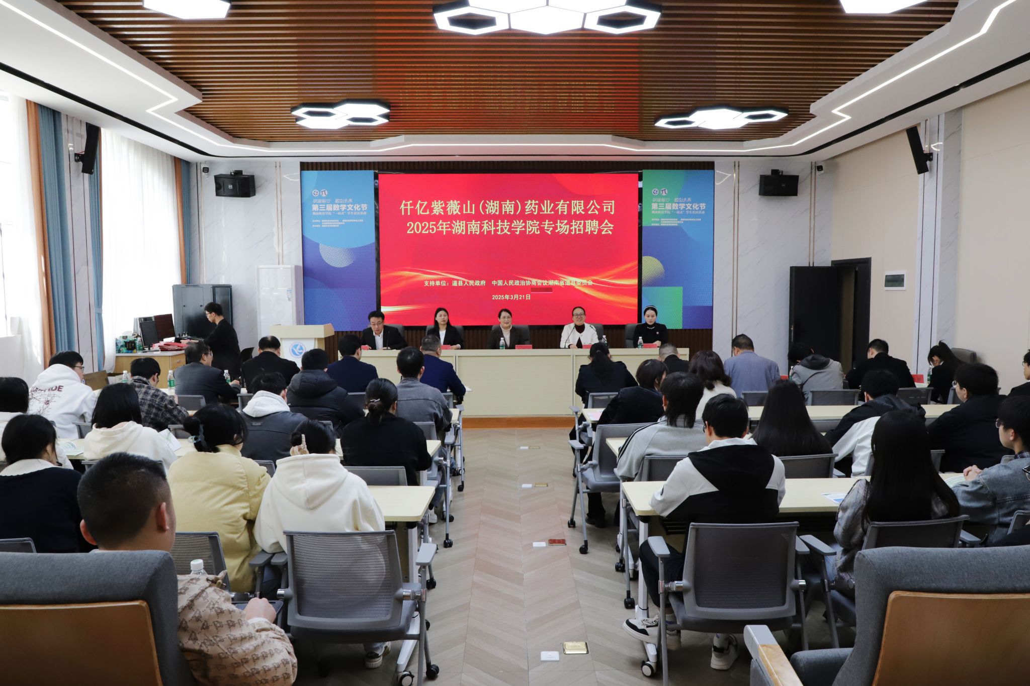 本网讯(通讯员 张亚南)3月21日,2025届毕业生道县高新区专场招聘会在我校举行。道县政协党组书记、主席刘忠华一行携省级高新技术企业仟亿紫薇山(湖南)药业有限公司代表团来校开展人才招聘。副校长郑银芳出席活动并致辞,招生就业与创新创业指导处处长胡清华主持活动。